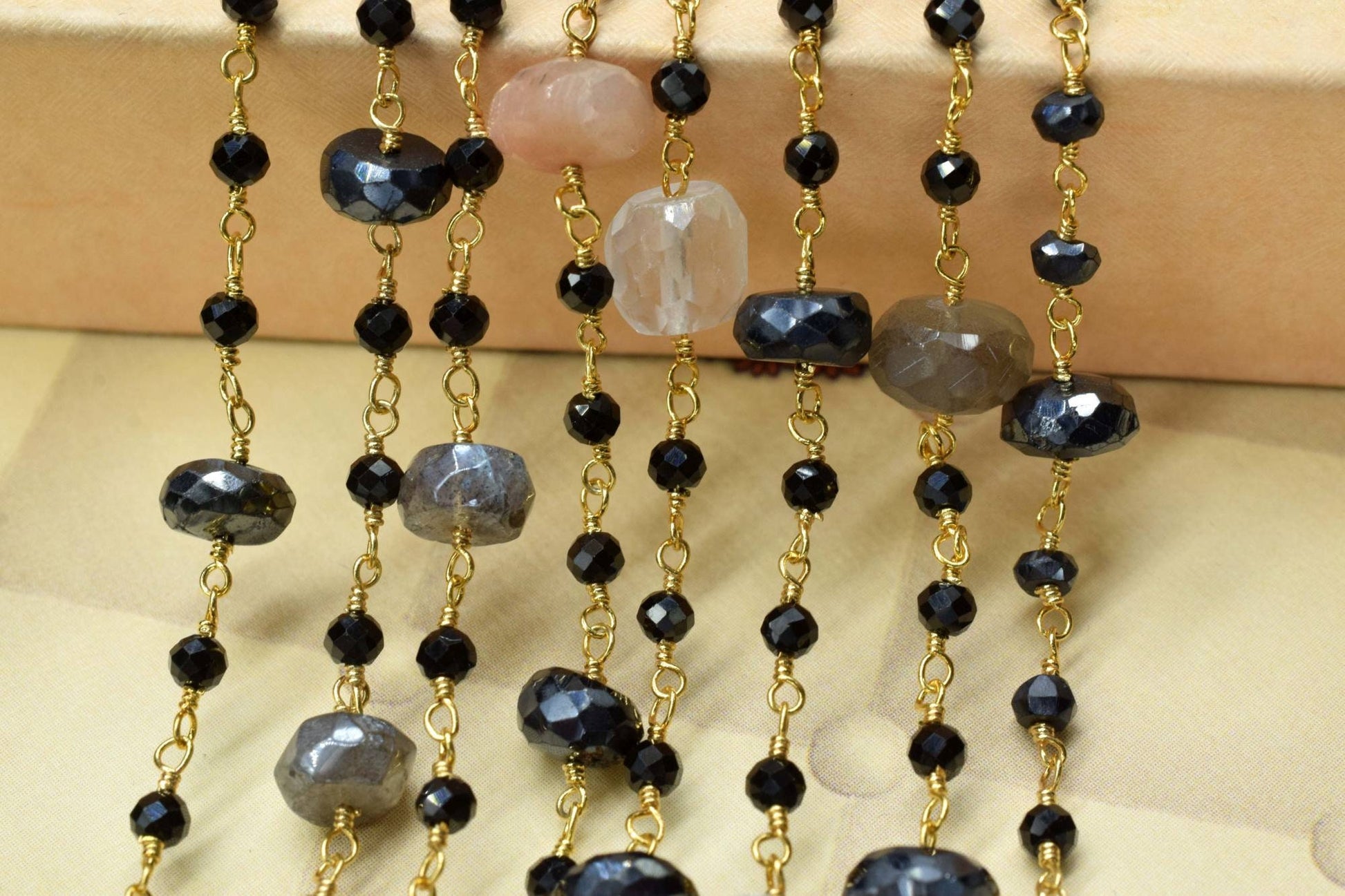 4 mm Black onyx Rosary Chain,multi moonstone Faceted Beaded Chain,Wire Wrapped gold Plated Chain,bigger size beaded ,rosary ,dual gemstone,