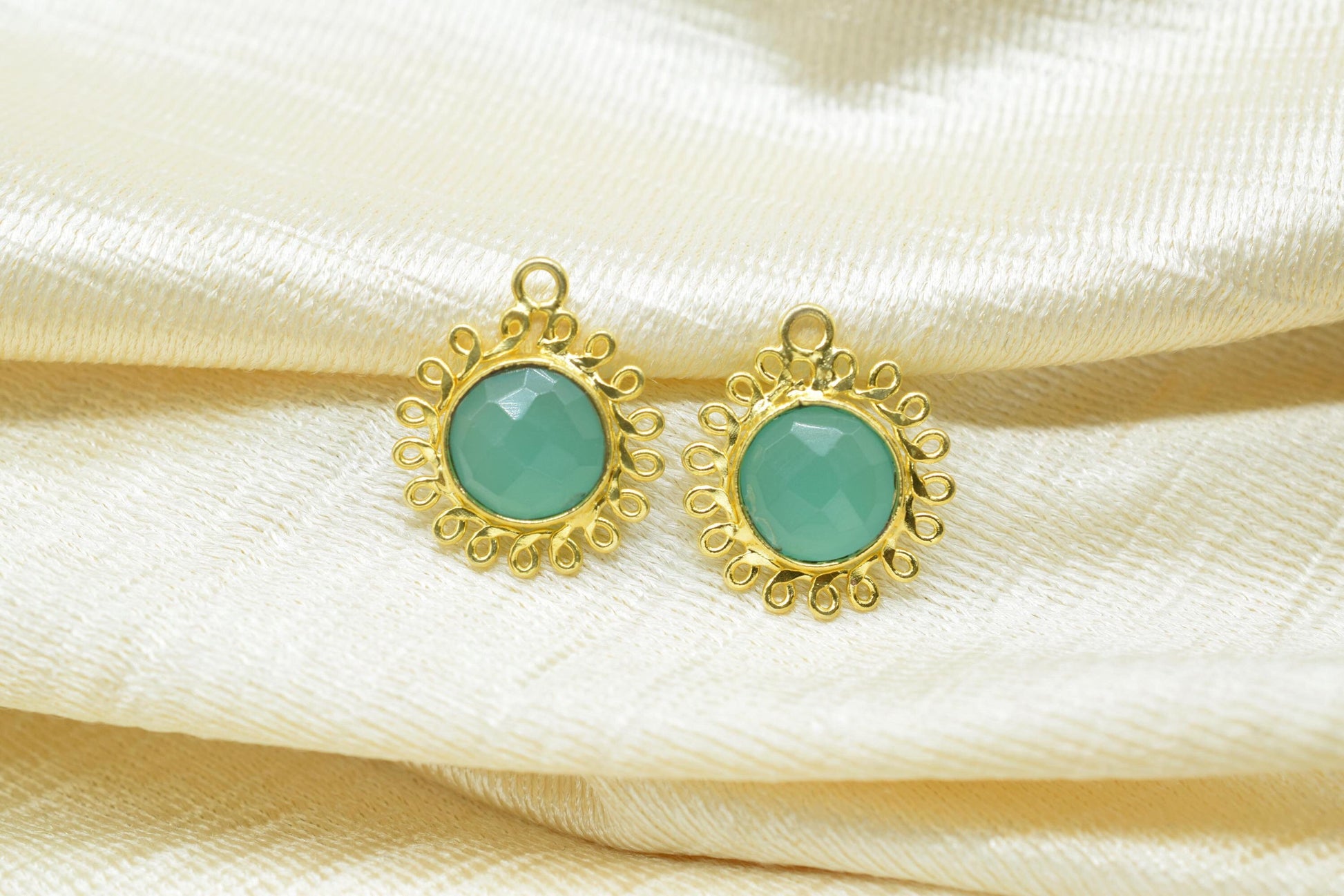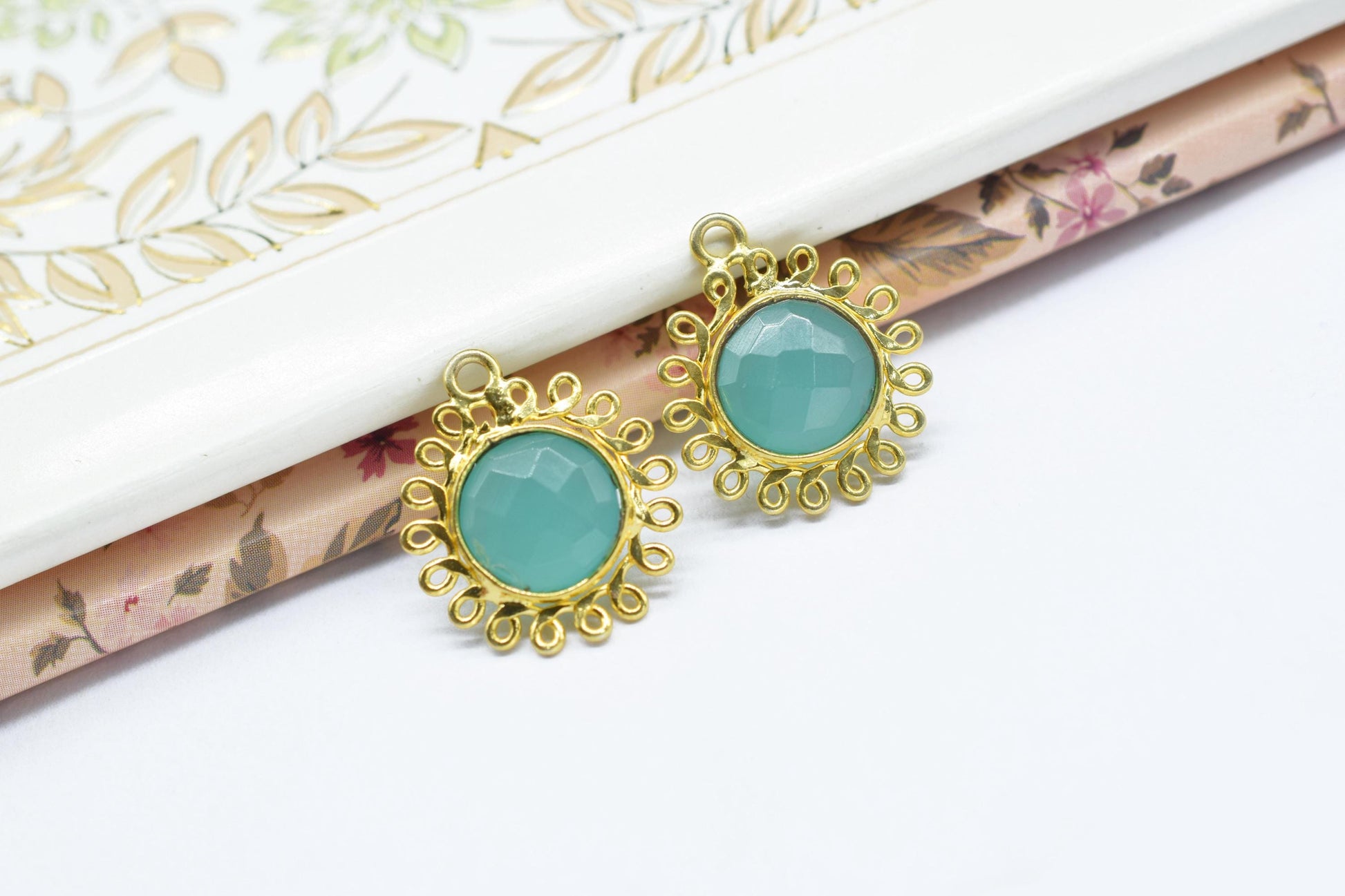 Aqua Chalcedony 10mm Round Bezel Charm,Gemstone Brass Component,Single Bail Pendant,Round Faceted charms,Handmade Jewellery Connector,Gift