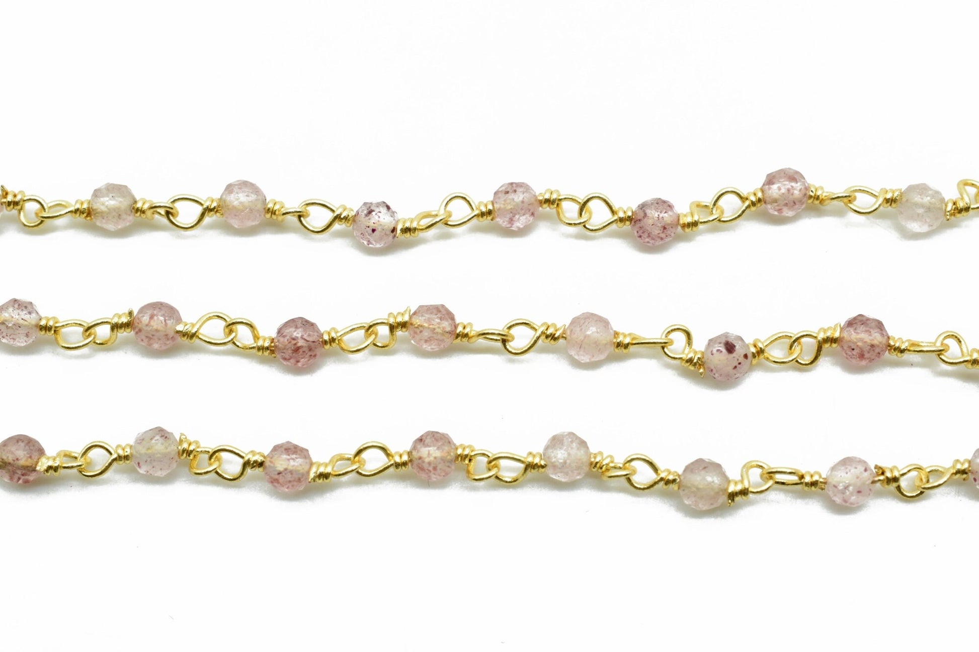 Berry Quartz 3mm Beaded Chain,Berry Quartz wire wrapped chain,Gold chain,rosary chain,jewelry making supplies,Gold Plated Wire Wrapped Chain