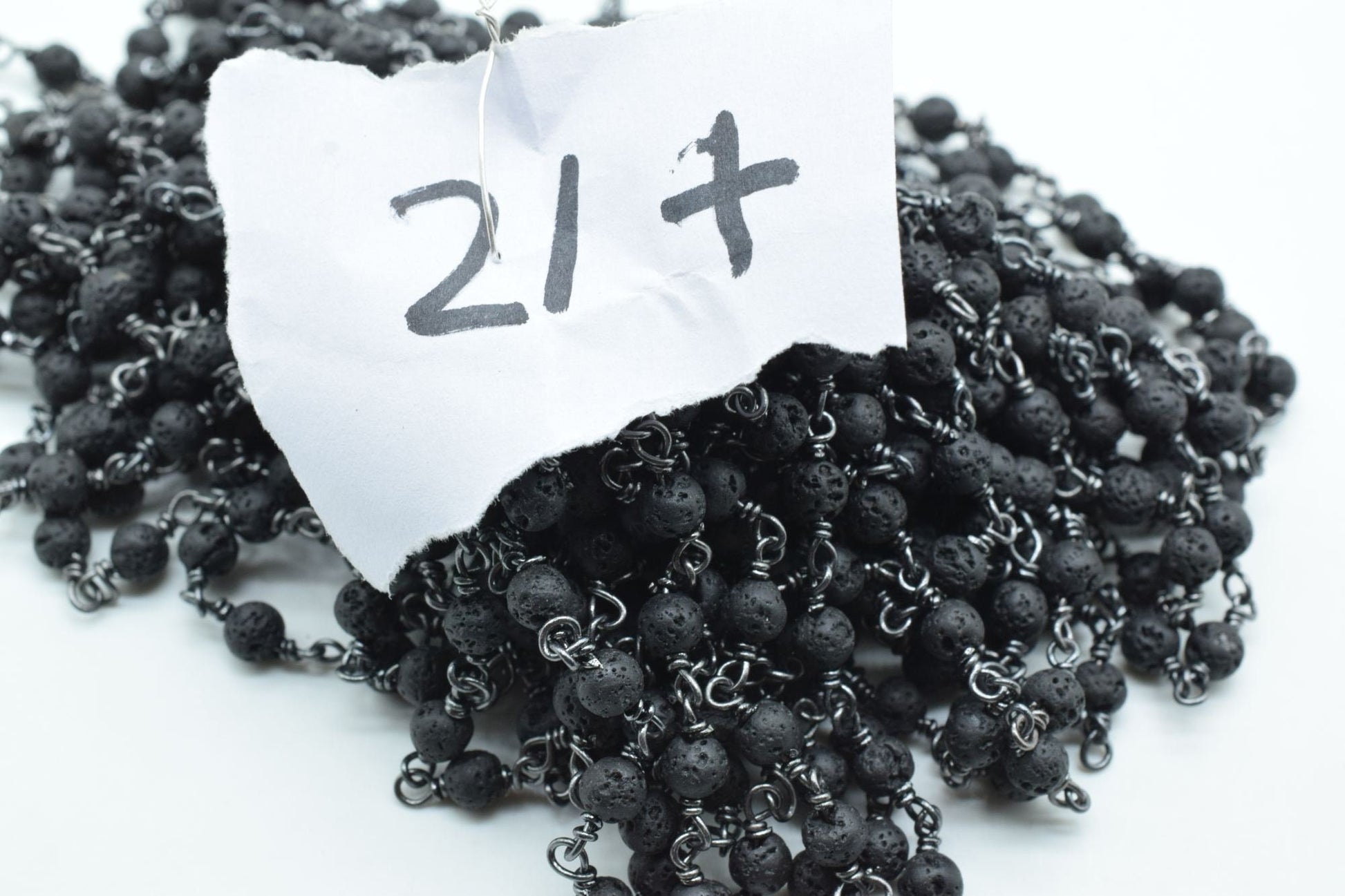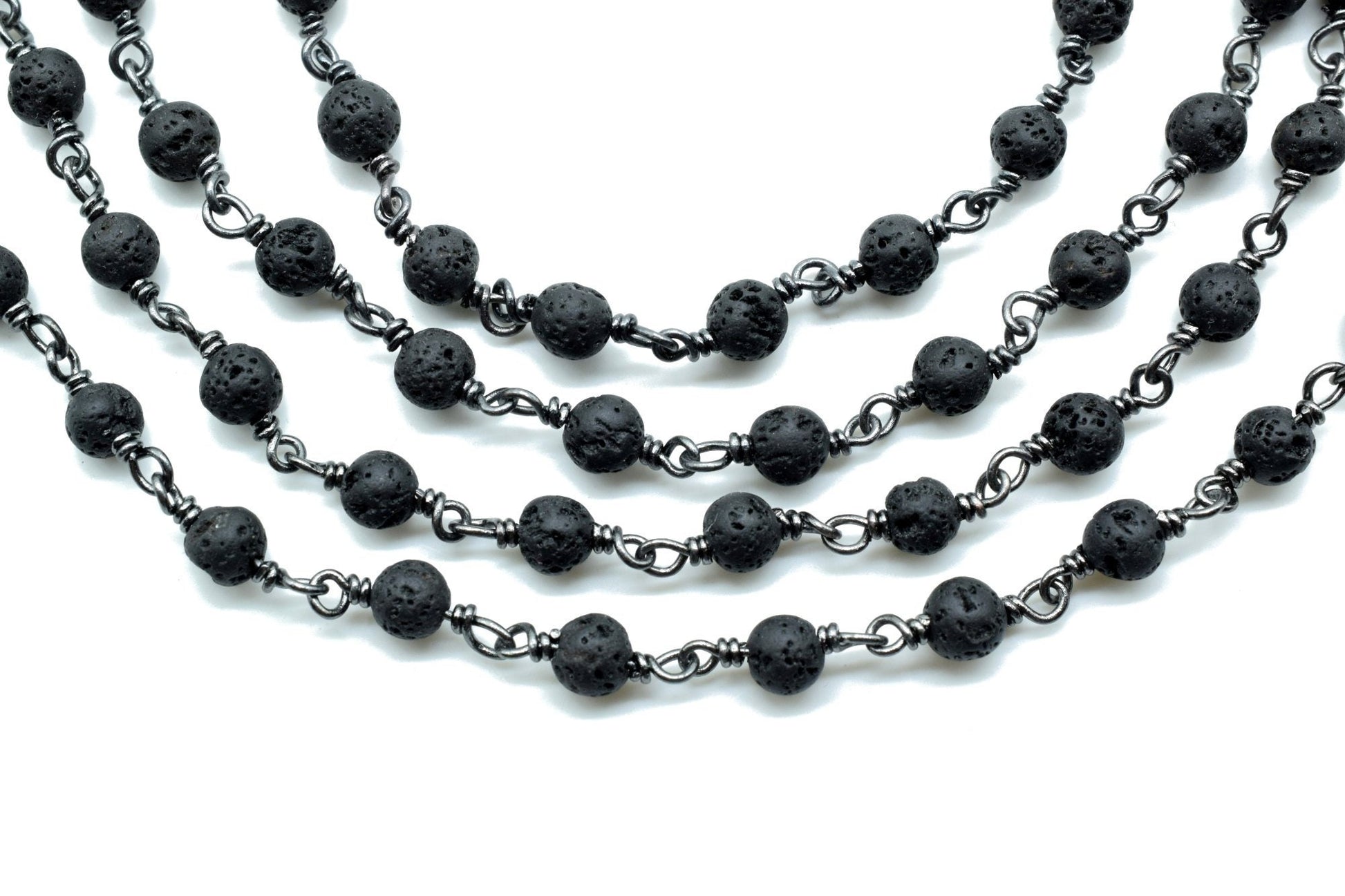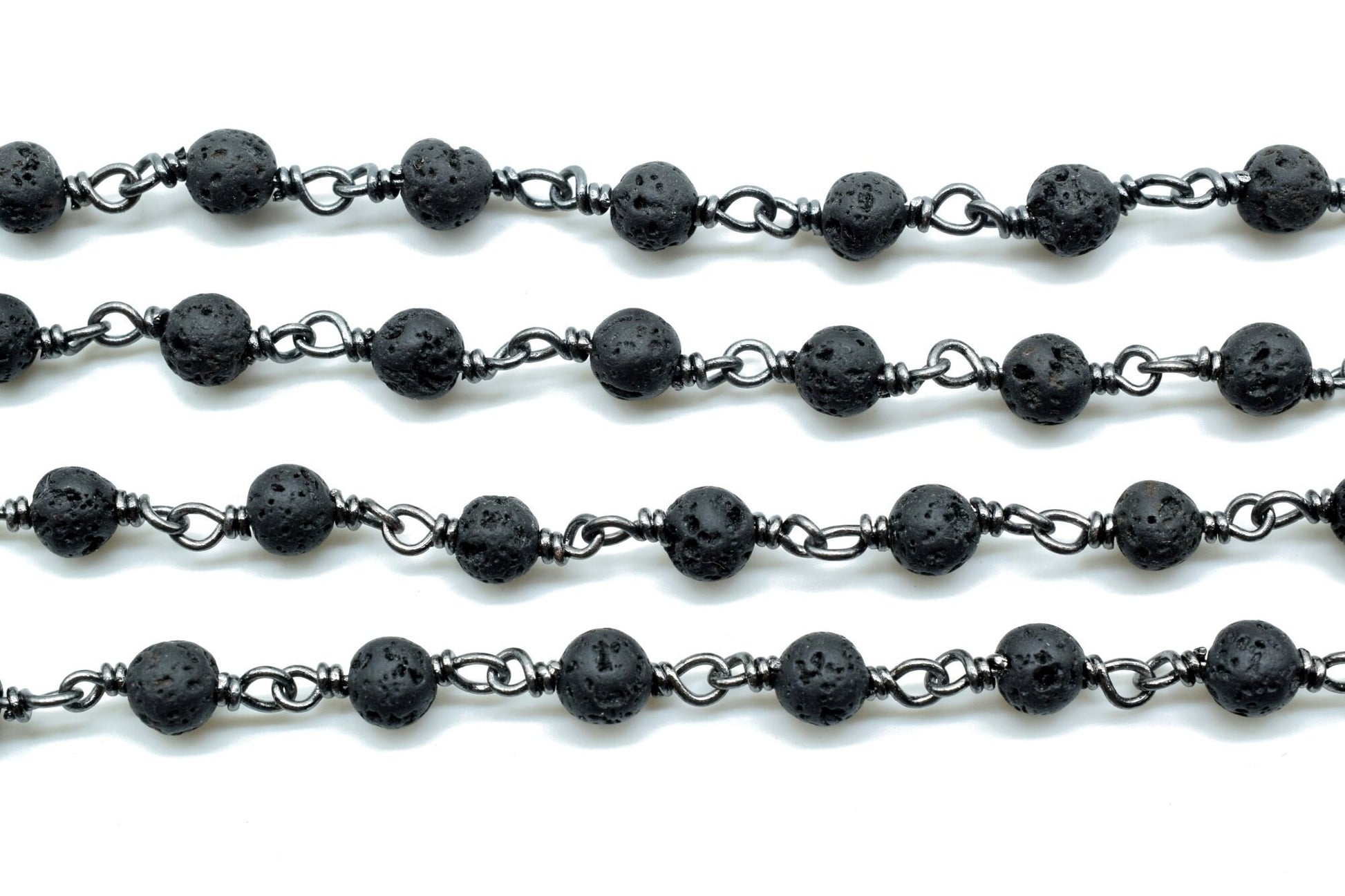 Black Lava Rock 4mm Round Beaded Wire Wrapped Black Polished Plated Chain -Beaded Chain,Black Lava Rosary Chain,Delicate Rosary Beaded Chain