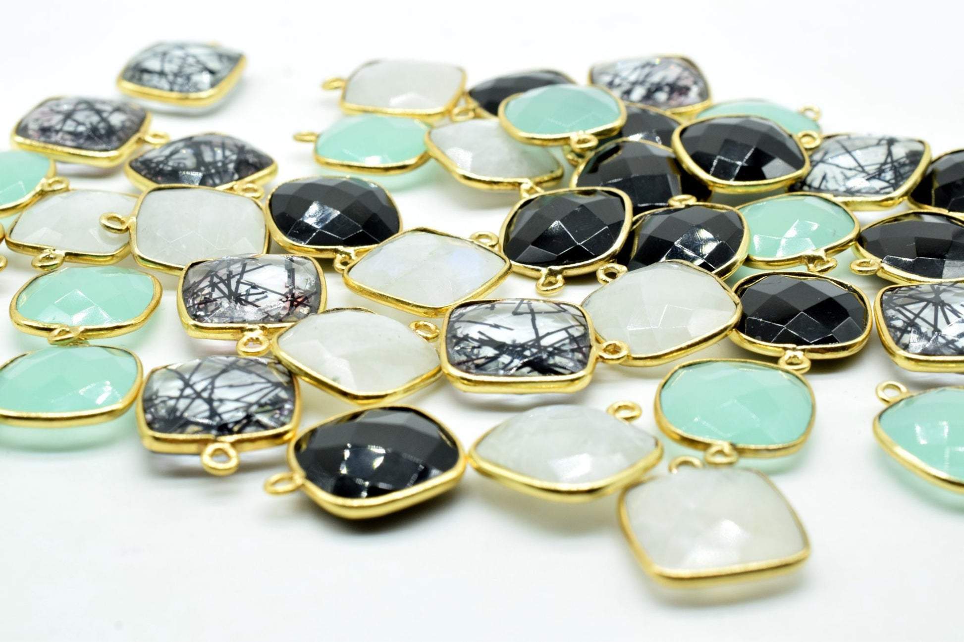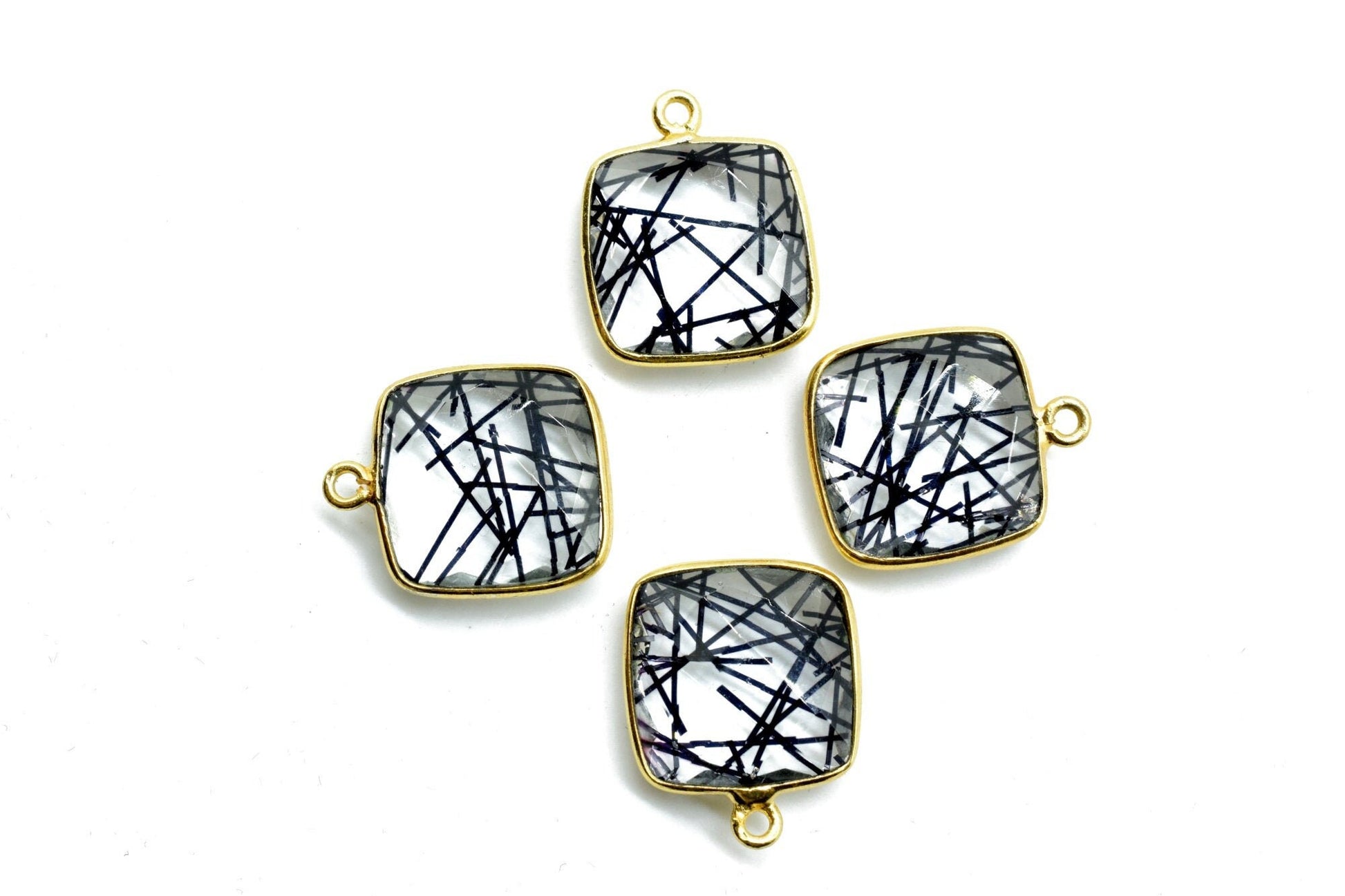 Black Rutile 14mm Cushion Bezel charm,Black Rutile Components Cushion Shape Connectors,Black Rutile Single Bail Over Brass Gold Edge Jewelry