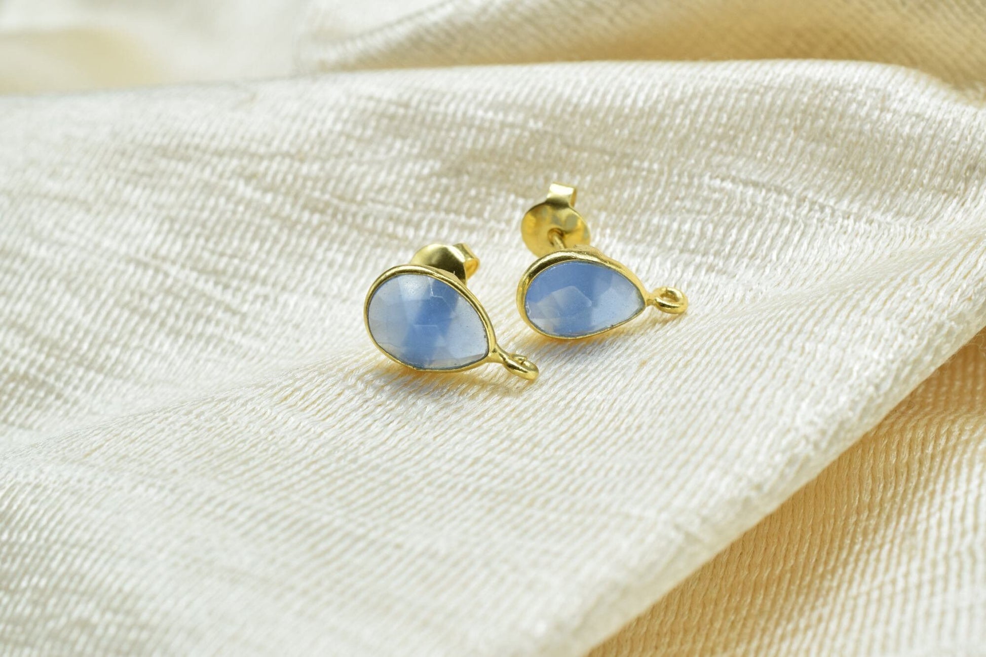 Blue Chalcedony 7x10mm Teardrop shape Earring connector Stud post setting with loop open bail, Blue Chalcedony Gold Plated Earring With Loop