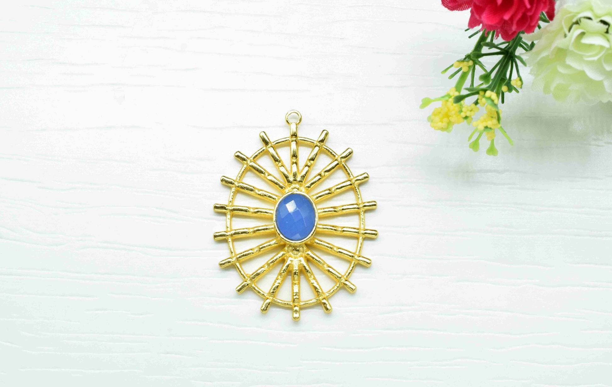 .Blue Chalcedony Gemstone Component Single Bail Charm, Blue Chalcedony Connector Pendant,Gold Plated Connectors ,Pendant Jewelry, Earring