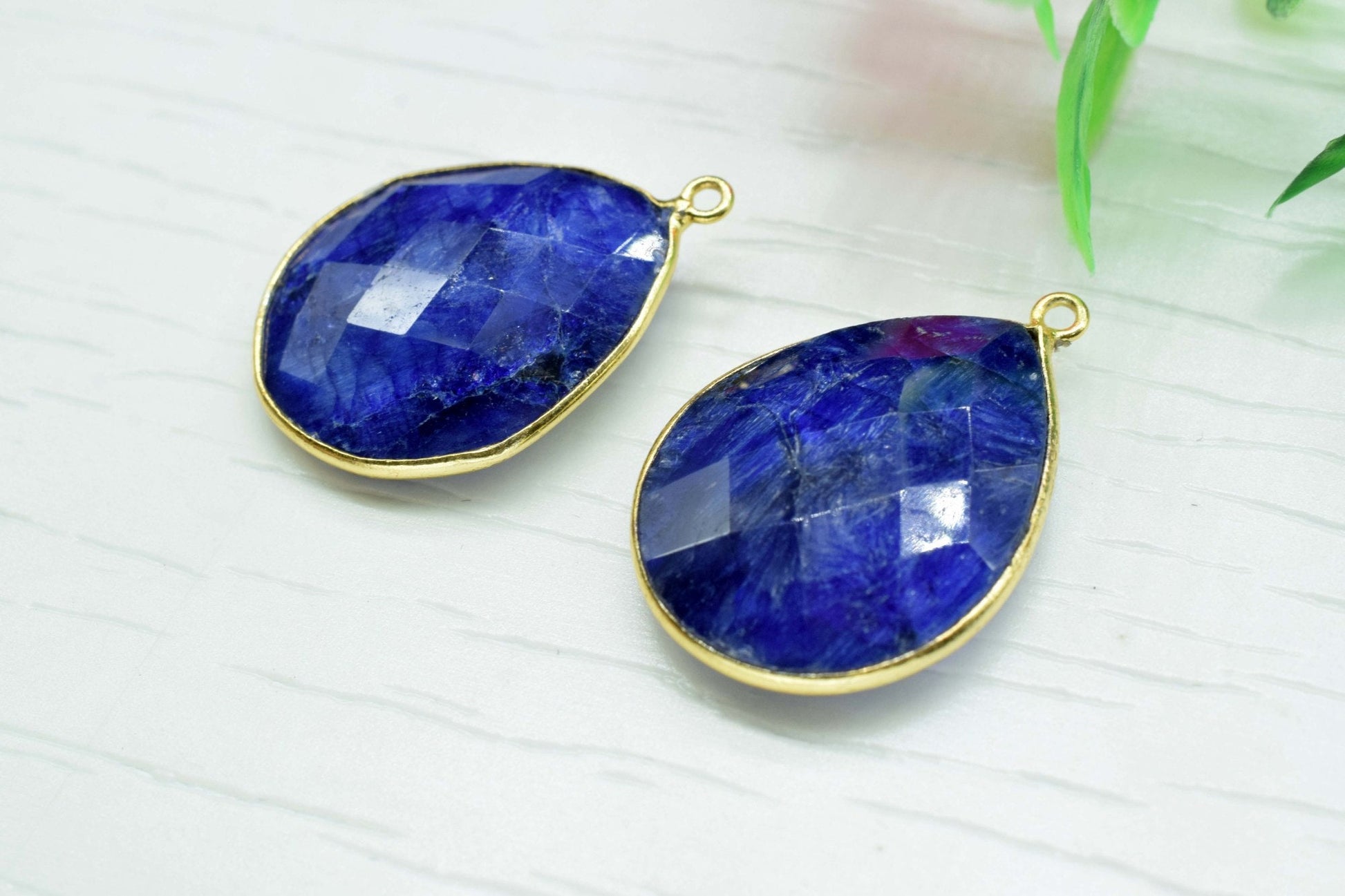 Blue Sapphire 18x23mm Pear shape Single bail connectors,Sapphire Gold plated bezel,Sapphire Briolettes,Sapphire Connector,Sapphire earrings