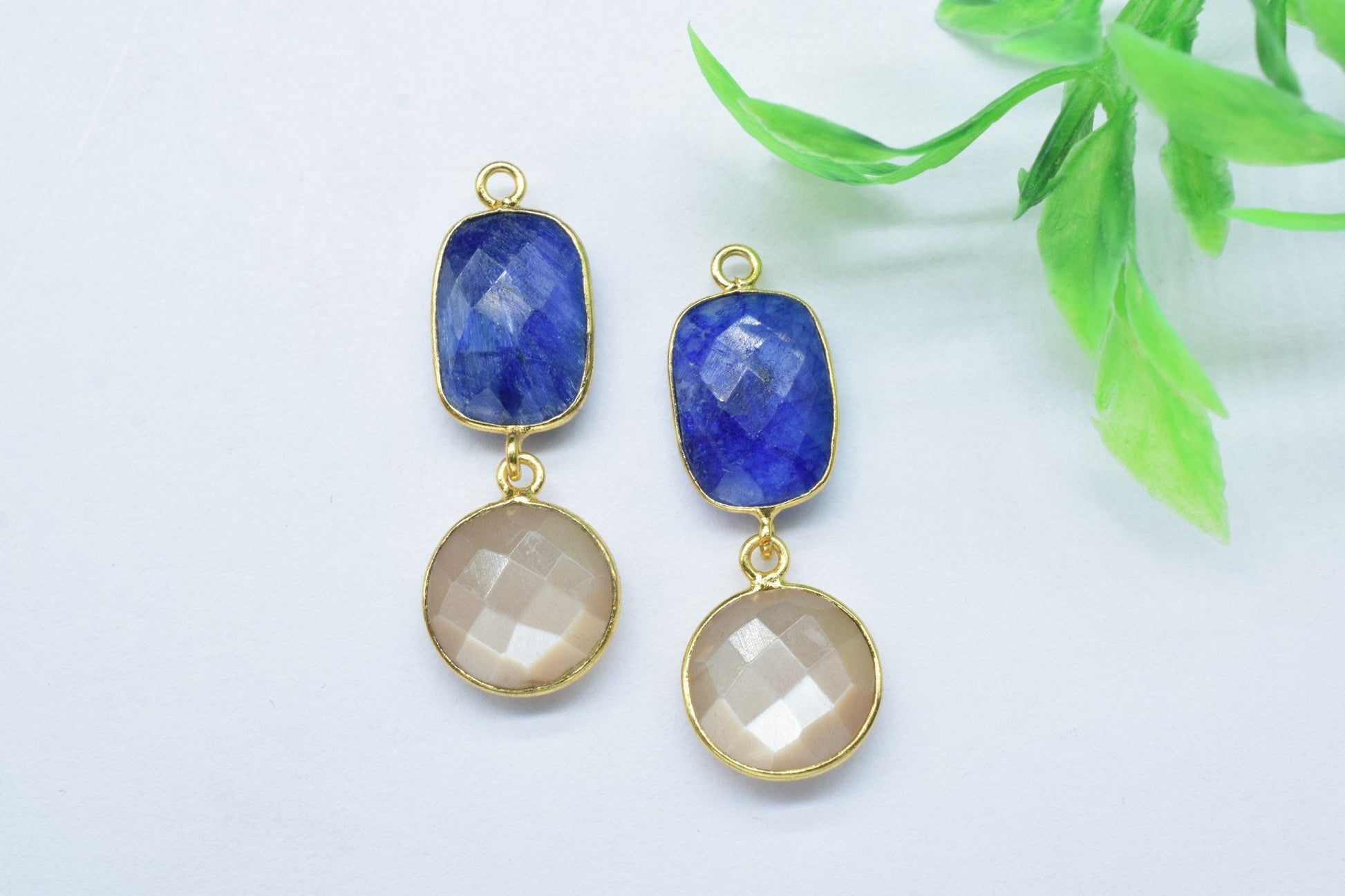 Blue Sapphire & Peach Moonstone Connector,Handmade Pendant,Multi Stone Pendant Charms Necklace,Station Bezel Link,Gemstone Earring Connector