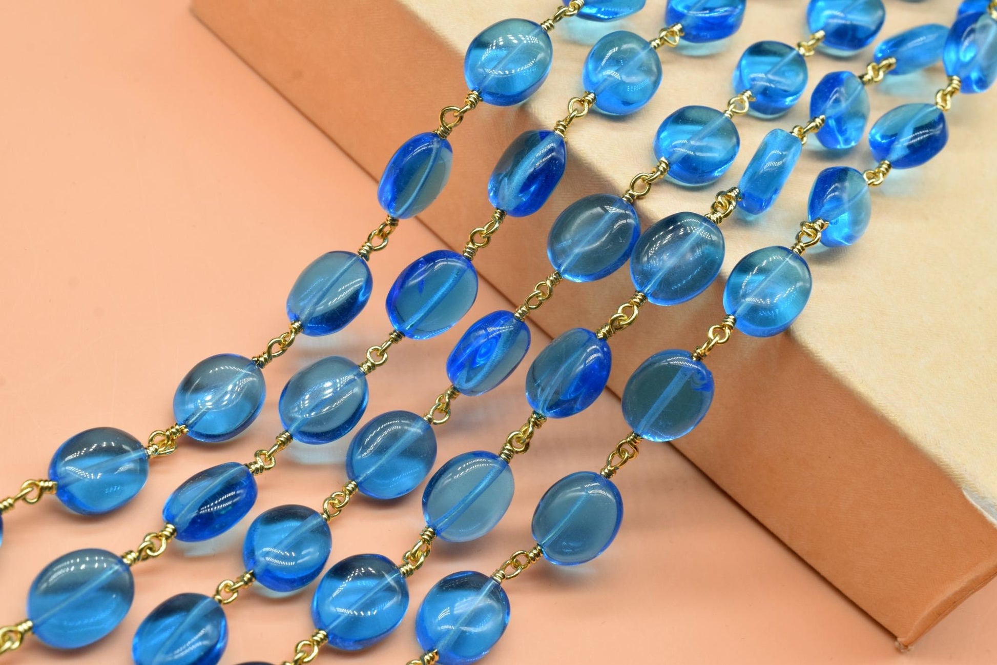 Blue Topaz Oval Shape Rosary,Blue Topaz Oval Beaded Chain,Topaz Wire Wrapped Rosary,Blue Topaz Briolette Beads,Rosary Chain Gold Plated Wire