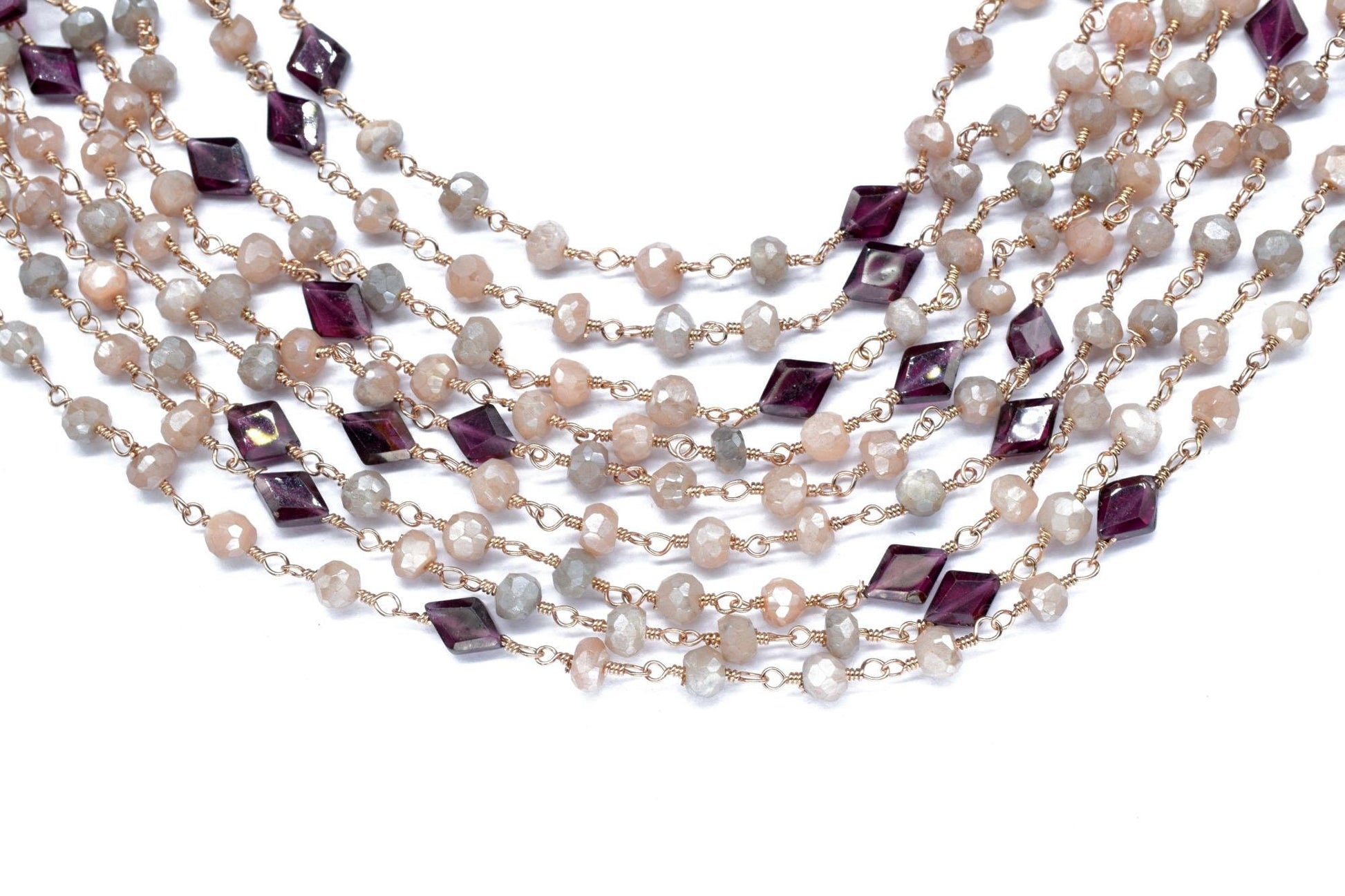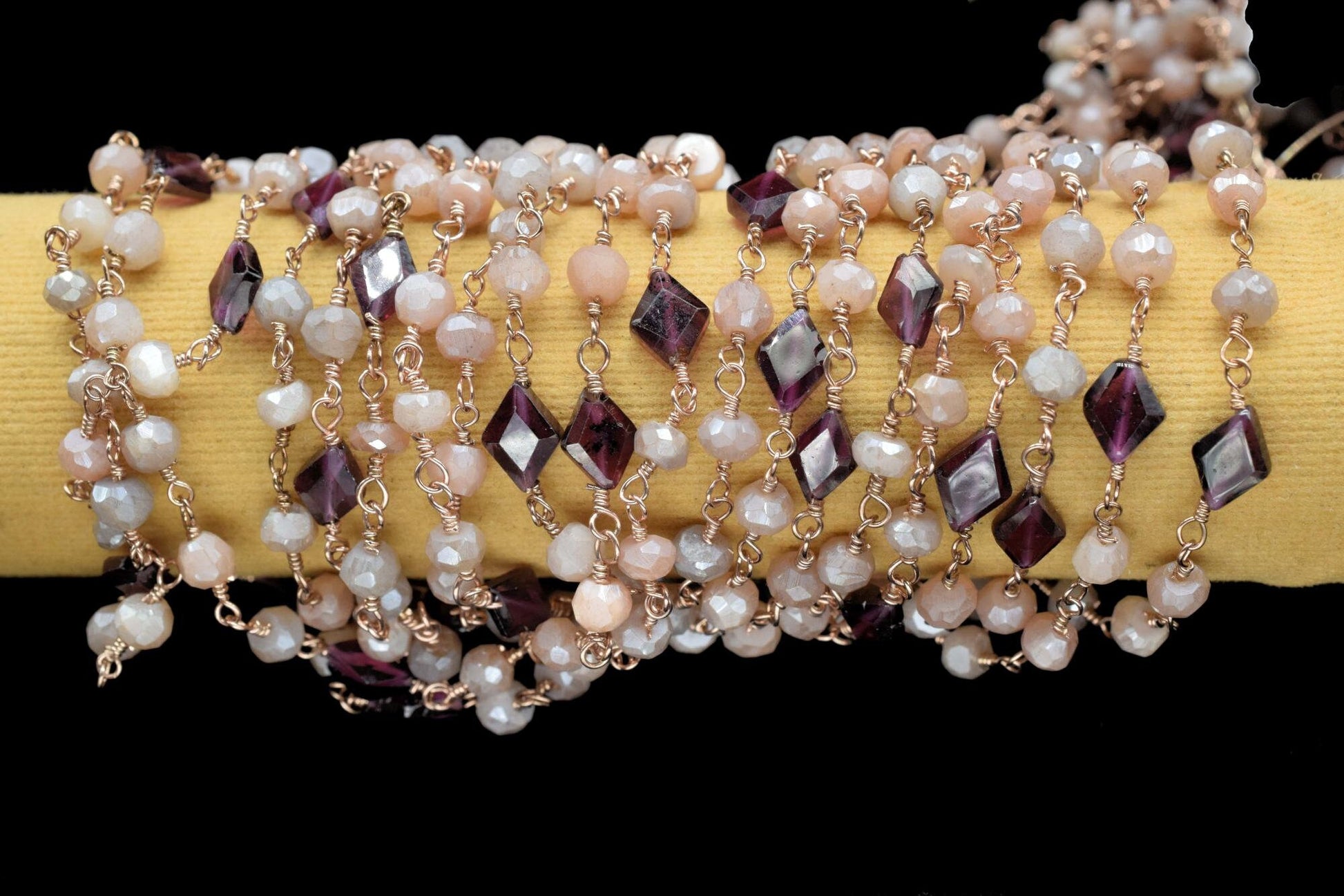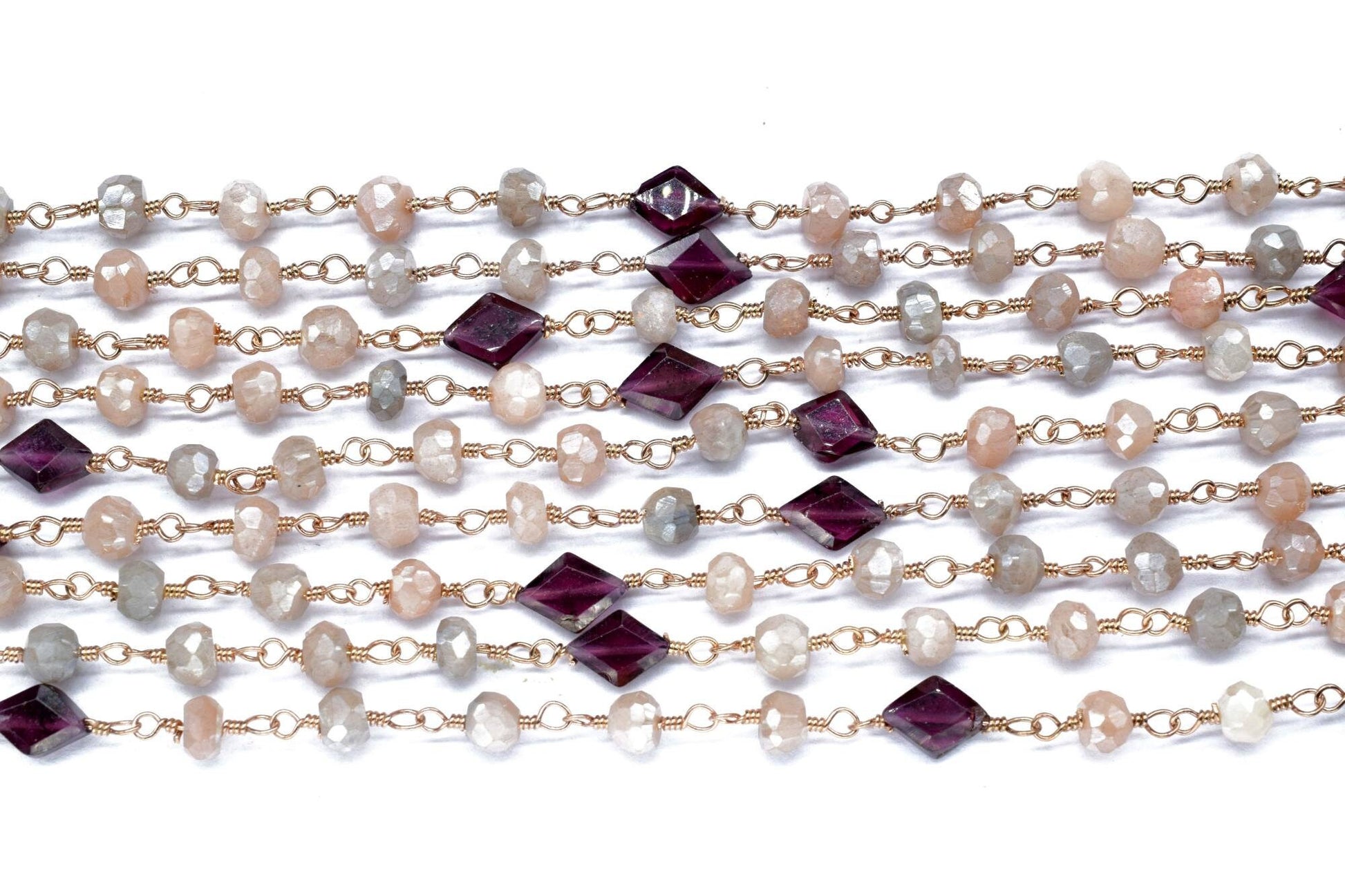 Chocolate/Peach Moonstone Gemstone Rosary Chain,3.5mm Faceted Beads, 24k Gold Plated Wire Wrapped Chain,garnet beaded chain,multi gemstone,