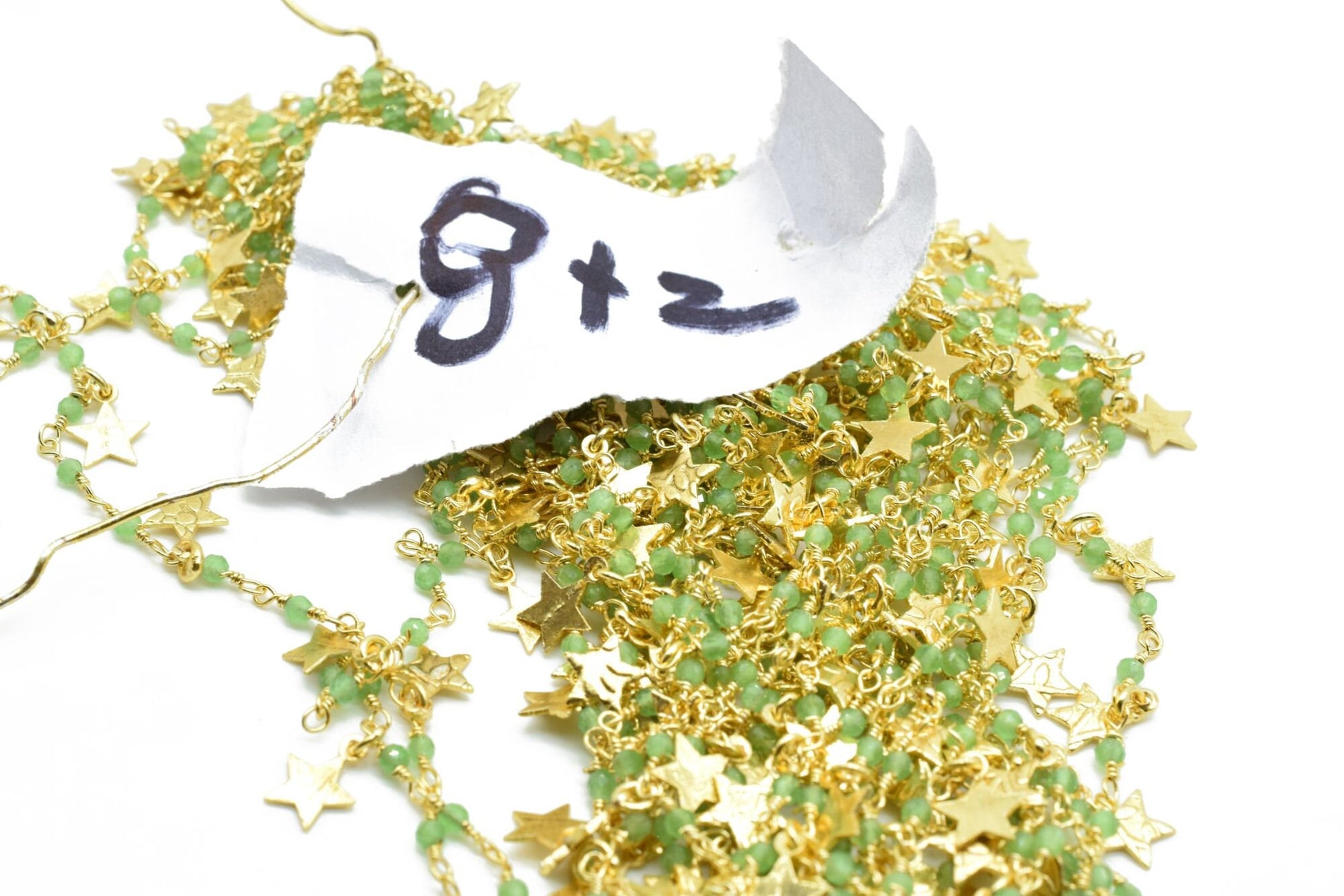 .Chrysoprase 2mm Beaded & Star Charm Chain,Rosary Style Chain -Chain per foot,Yellow Plated Wire Wrapped Chain,Jewelry Making Supplies,Jewels