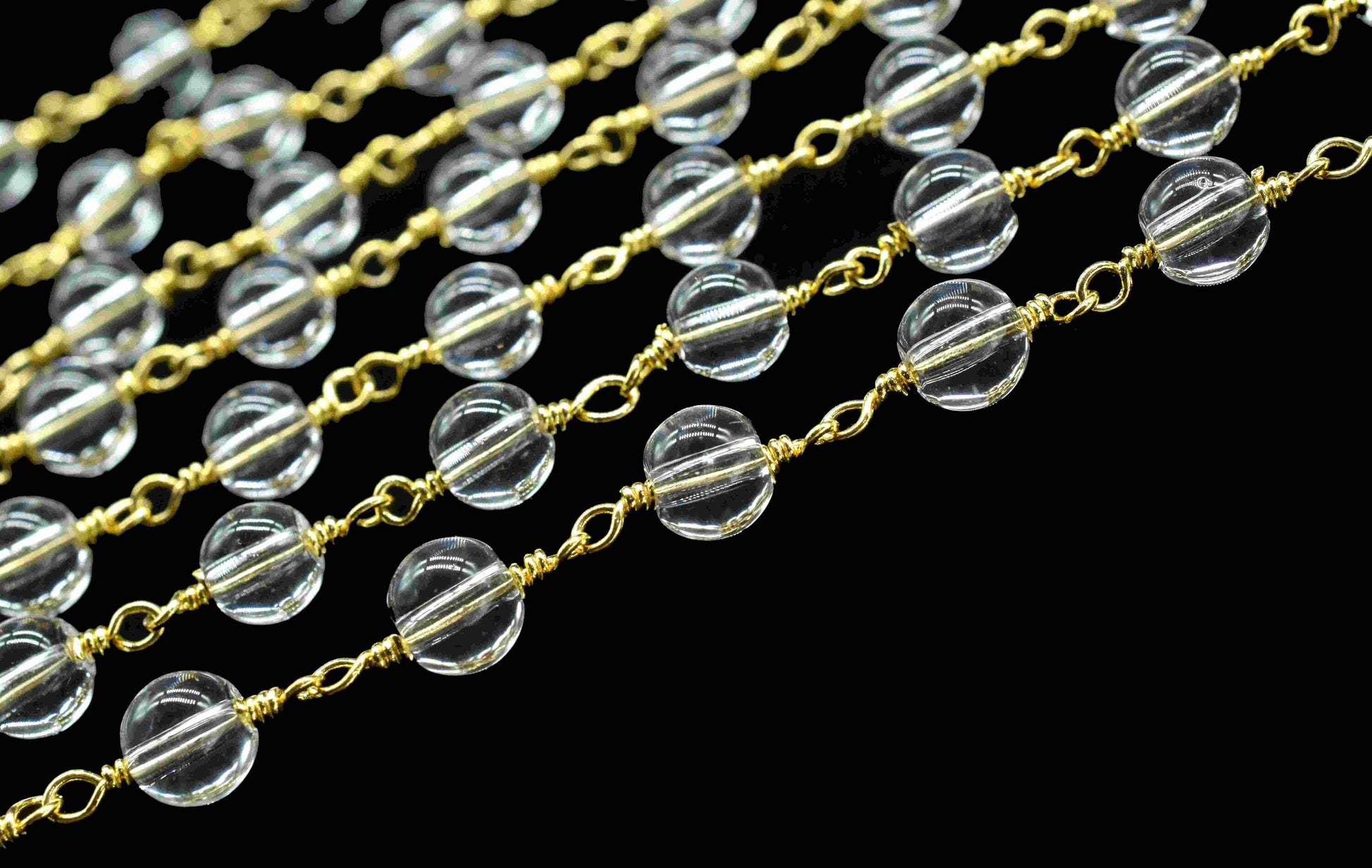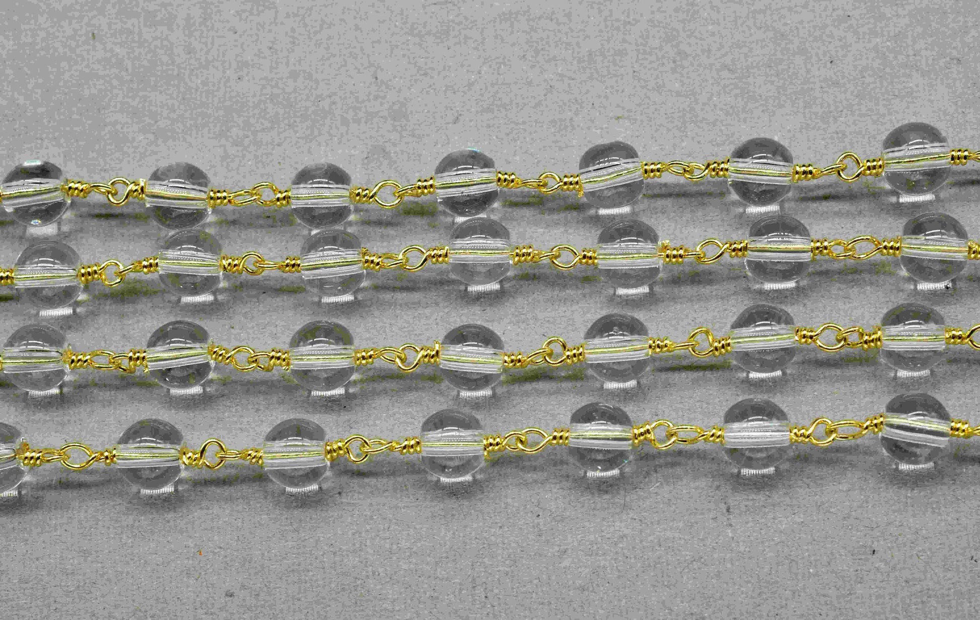 Crystal Quartz Smooth 6mm Round Beaded Chain,Crystal Brass Wire Wrapped Necklace Chain,Easy Open gold Chain,quartz gold Plating Beads Rosary