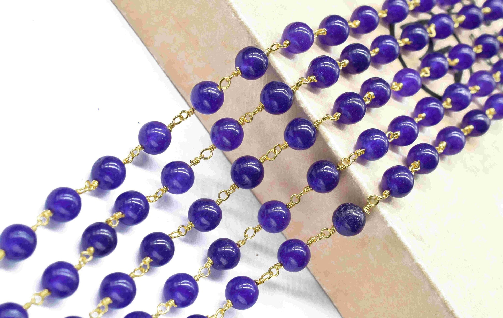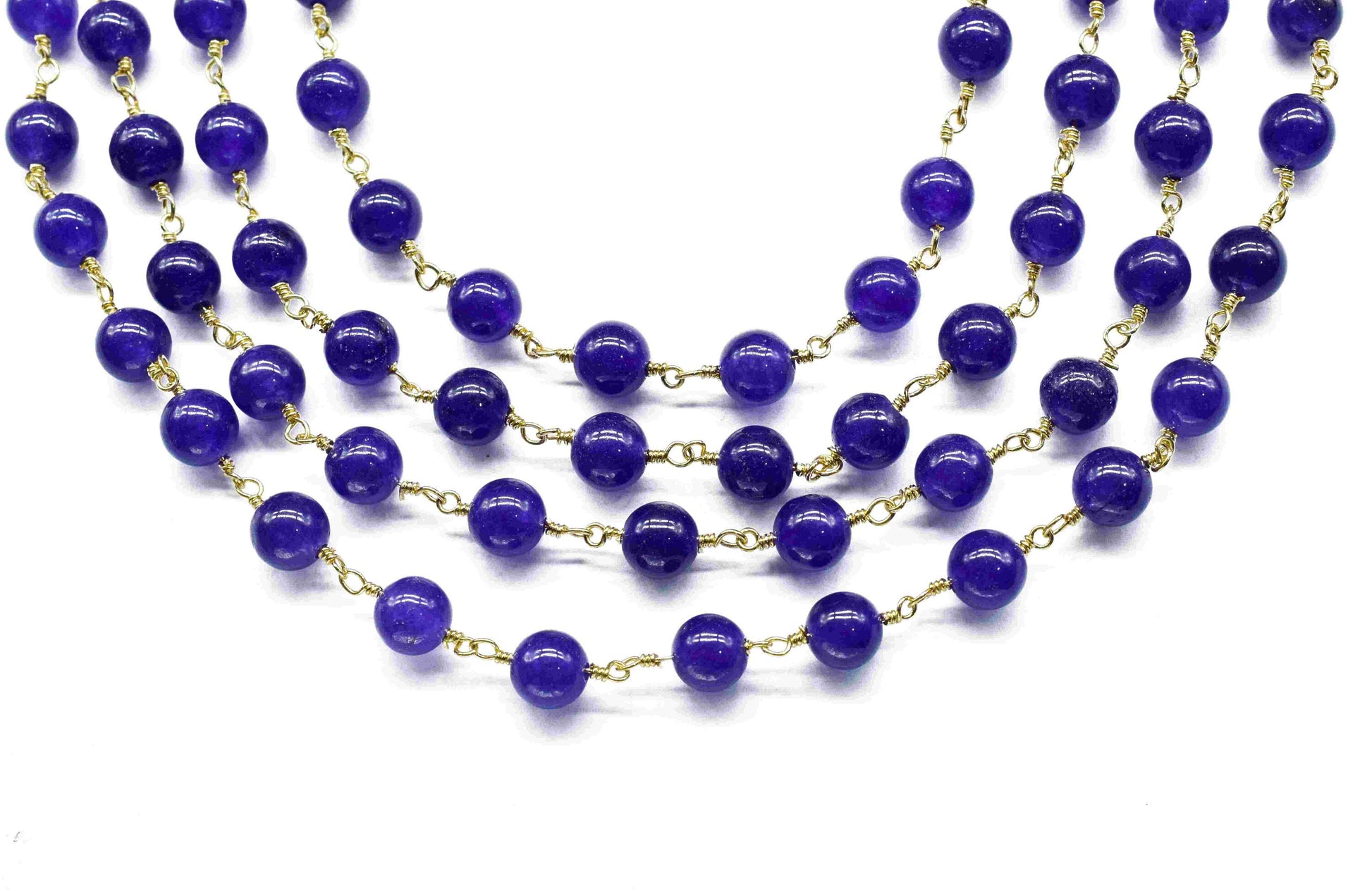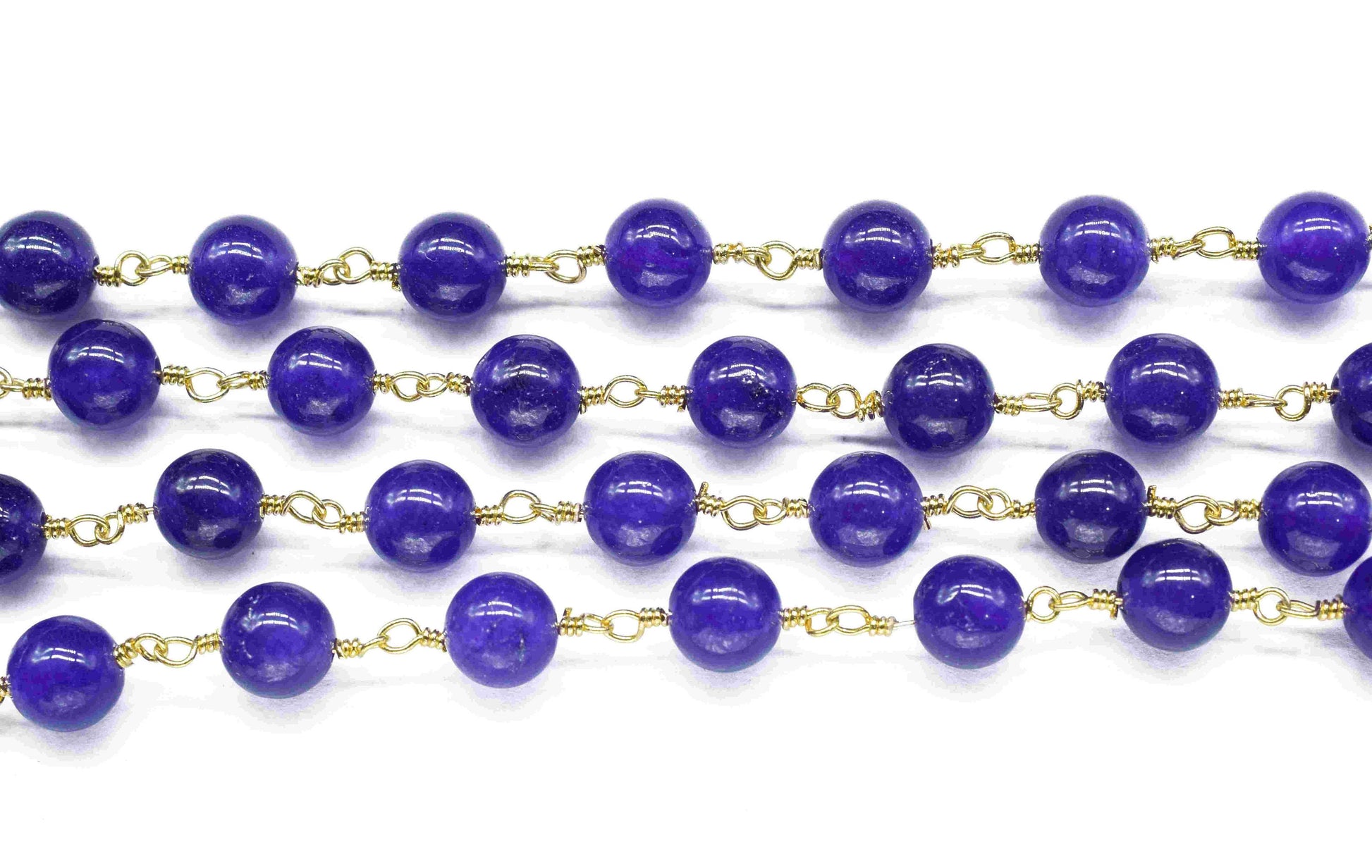 Dark Blue jade Bead Rosary Chain Jewelry,Dark Blue jade Wire Wrapped Gold Plating Bead Chain,Blue jade Smooth Gemstone 6mm Smooth Bead Chain