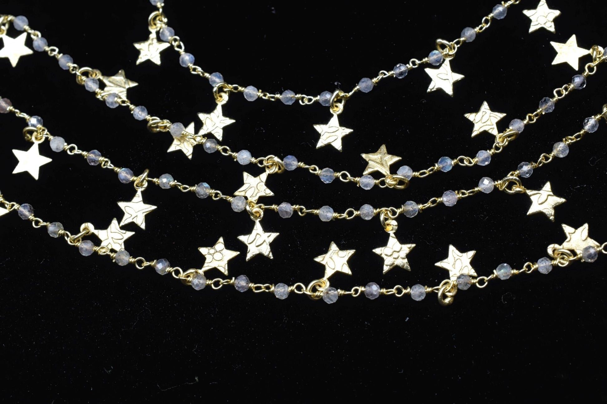 Labradorite 2mm Beaded & Star Charm Chain,Blue Fire Labradorite Rosary Chains,Gold Plating Wire Wrap Chain,Brass chain,Jewelry Making Chains
