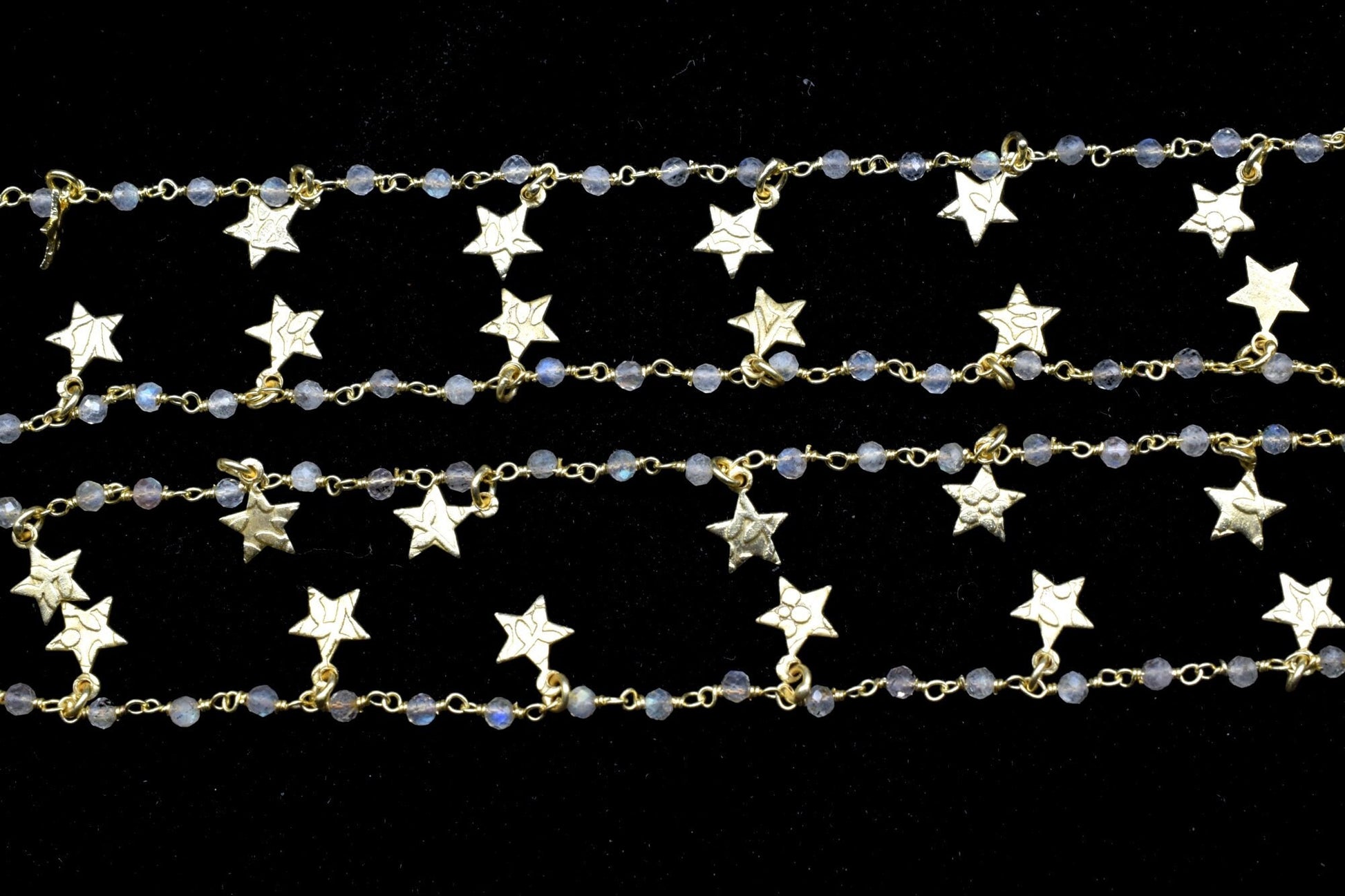 .Labradorite 2mm Beaded & Star Charm Chain,Blue Fire Labradorite Rosary Chains,Gold Plating Wire Wrap Chain,Brass chain,Jewelry Making Chains