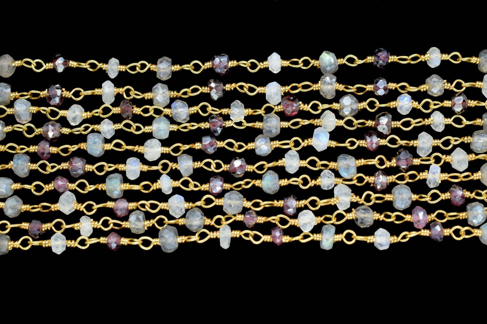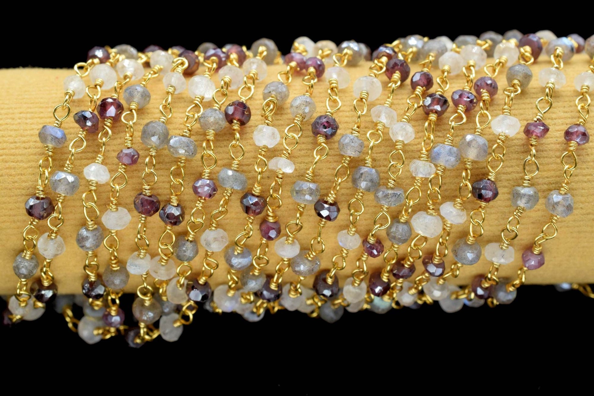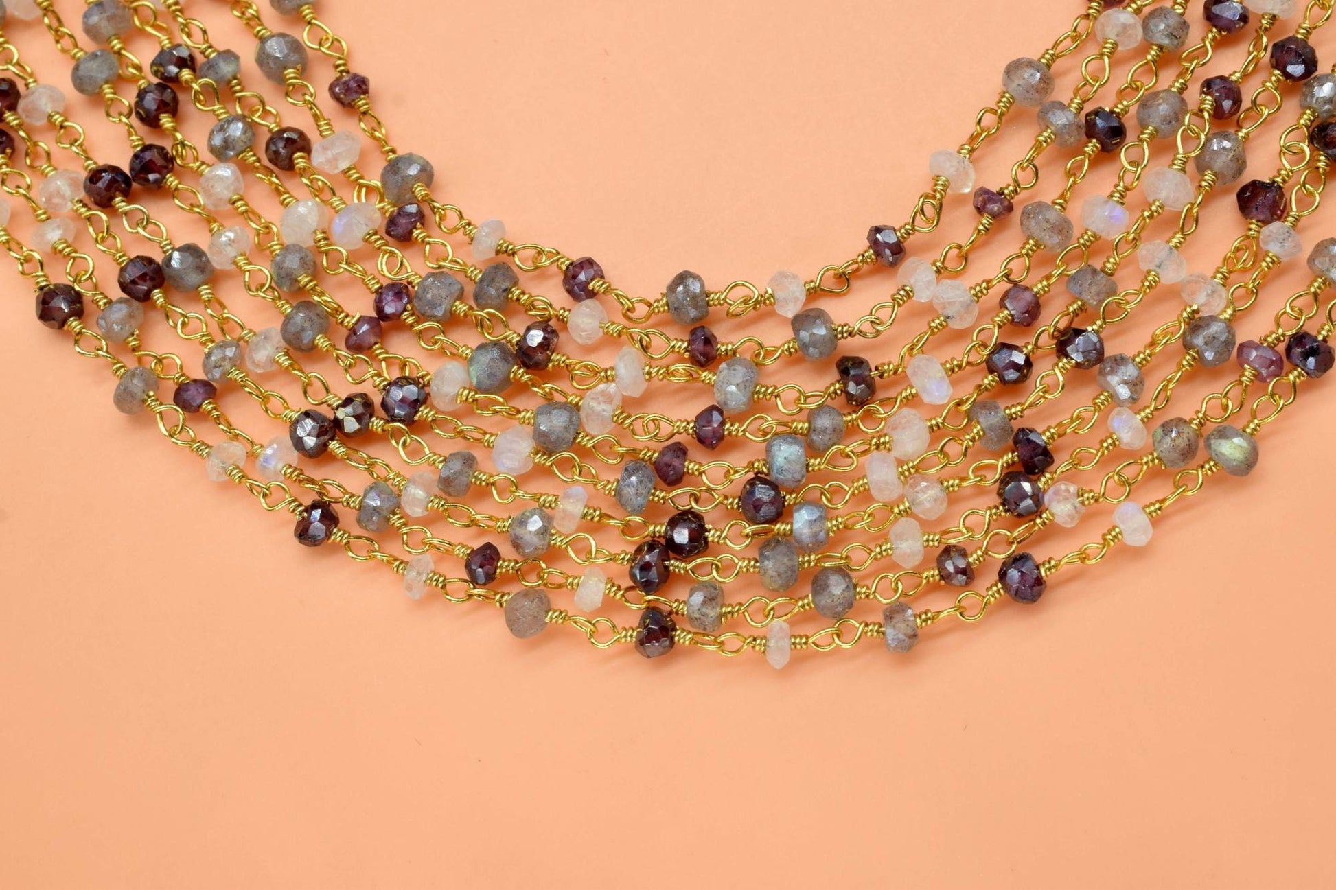 Labradorite 3mm Beaded Chain,garnet Rosary Chain,Gold Plating Wire Wrap Chain,moonstone beaded chain,combination rosary,multi gemstone,craft