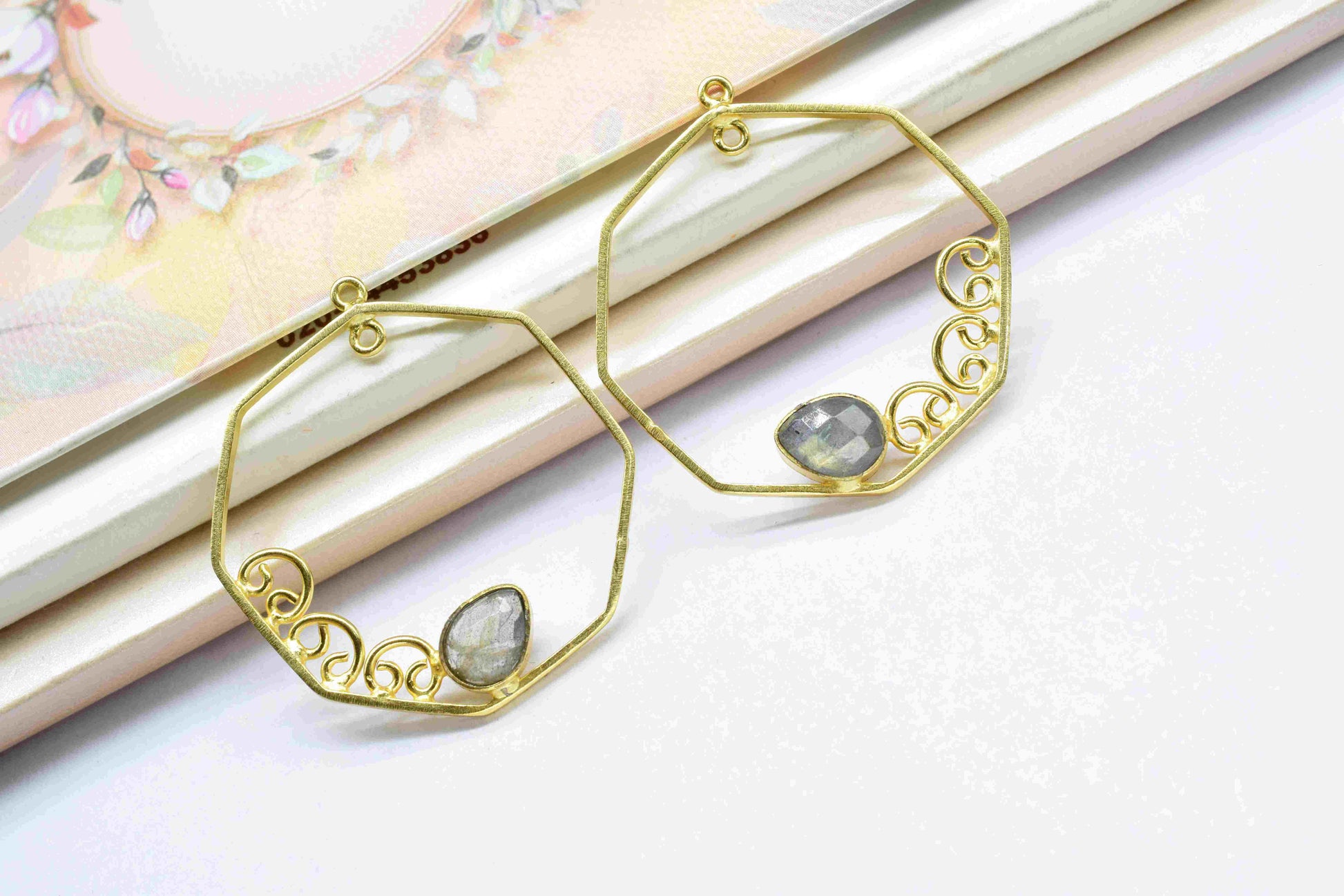 .Labradorite 6x8mm Teardrop Gemstone Pendant, Finding Hexagon Shape Single Bail Charm, Finding Gold Plated Connectors, Labradorite Earring, Gift