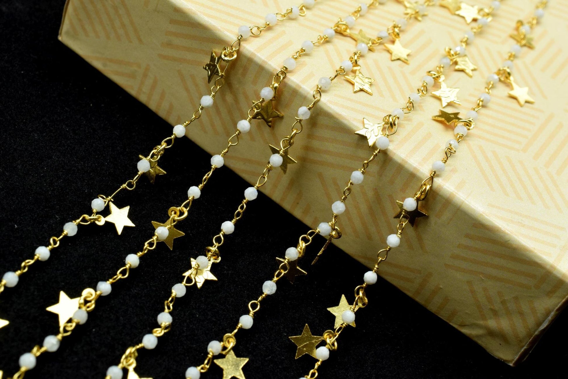 .Moonstone 2mm Beaded & Star Charm Chain,Moonstone Rosary Chains,Moonstone Gold Plating Wire Wrap Chain,Brass chain,Jewelry Making Chains