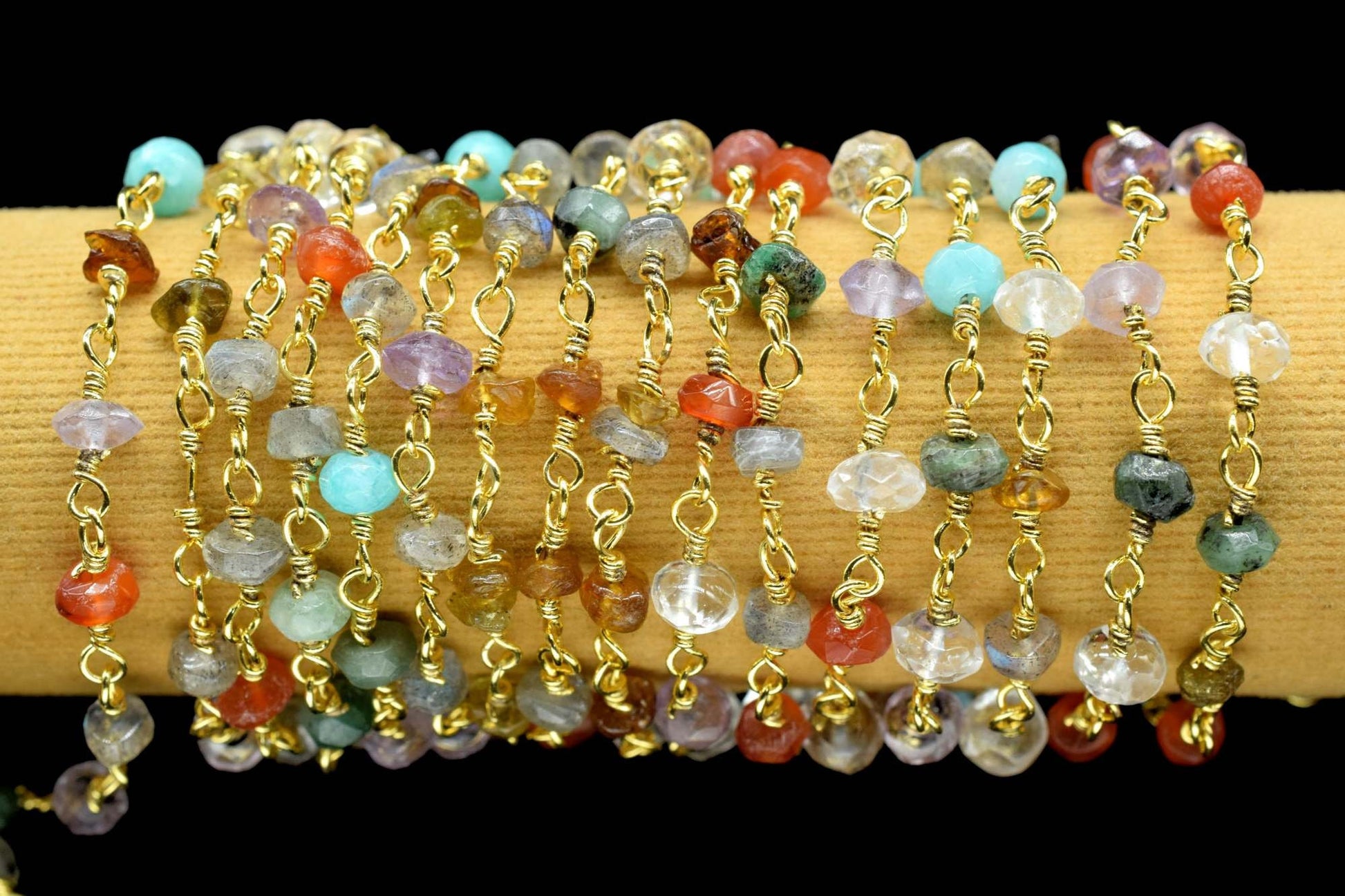 .Multi Disco Faceted Beads Rosary Chain,Jewelry Chain,Wire Wrapped Beaded Chain,Necklace Chain,Multi Gemstone rosary,Brass Beads chains Gift