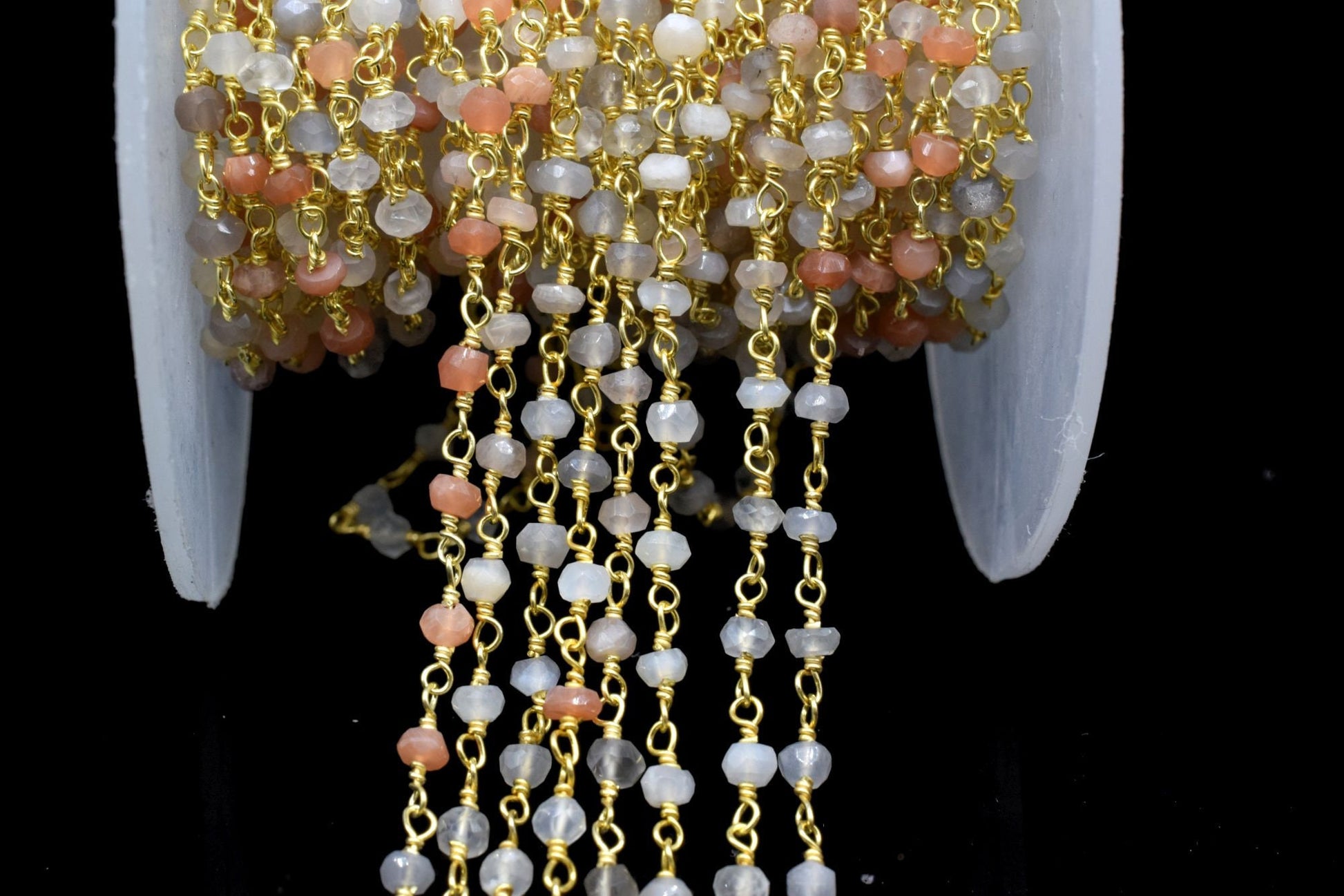 Multi Moonstone 3mm Beaded Chain,Multi Moonstone Wire Wrapped Chain,Moonstone Brass chain,Jewelry Making Chain,Moonstone Beads rosary chain