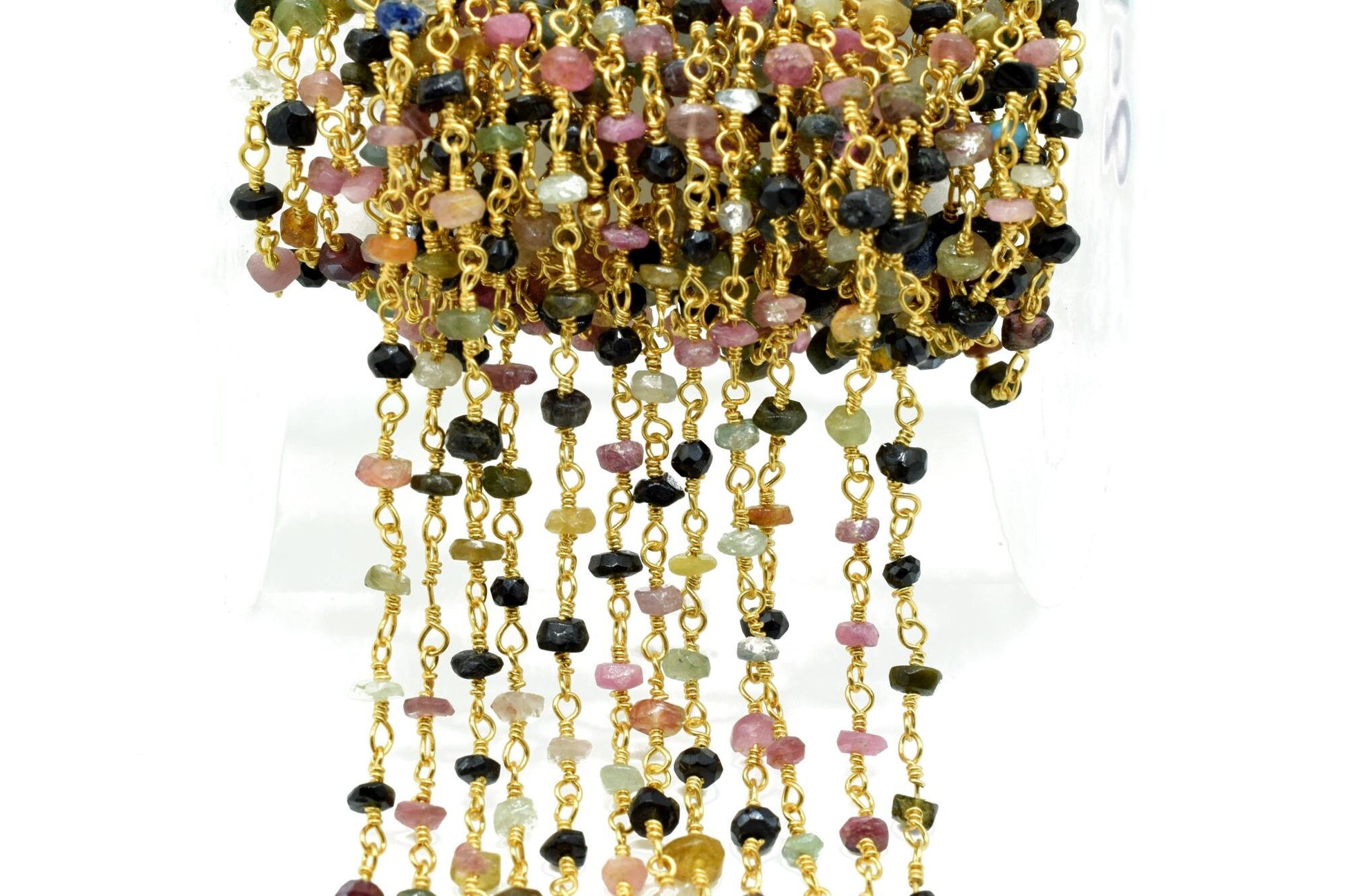 Multi Tourmaline Rosary Chain,Multi Tourmaline Wire Wrapped Rosary,3 to 3.5mm beaded chain,Natural Multi Tourmaline beaded Chain,gold chain