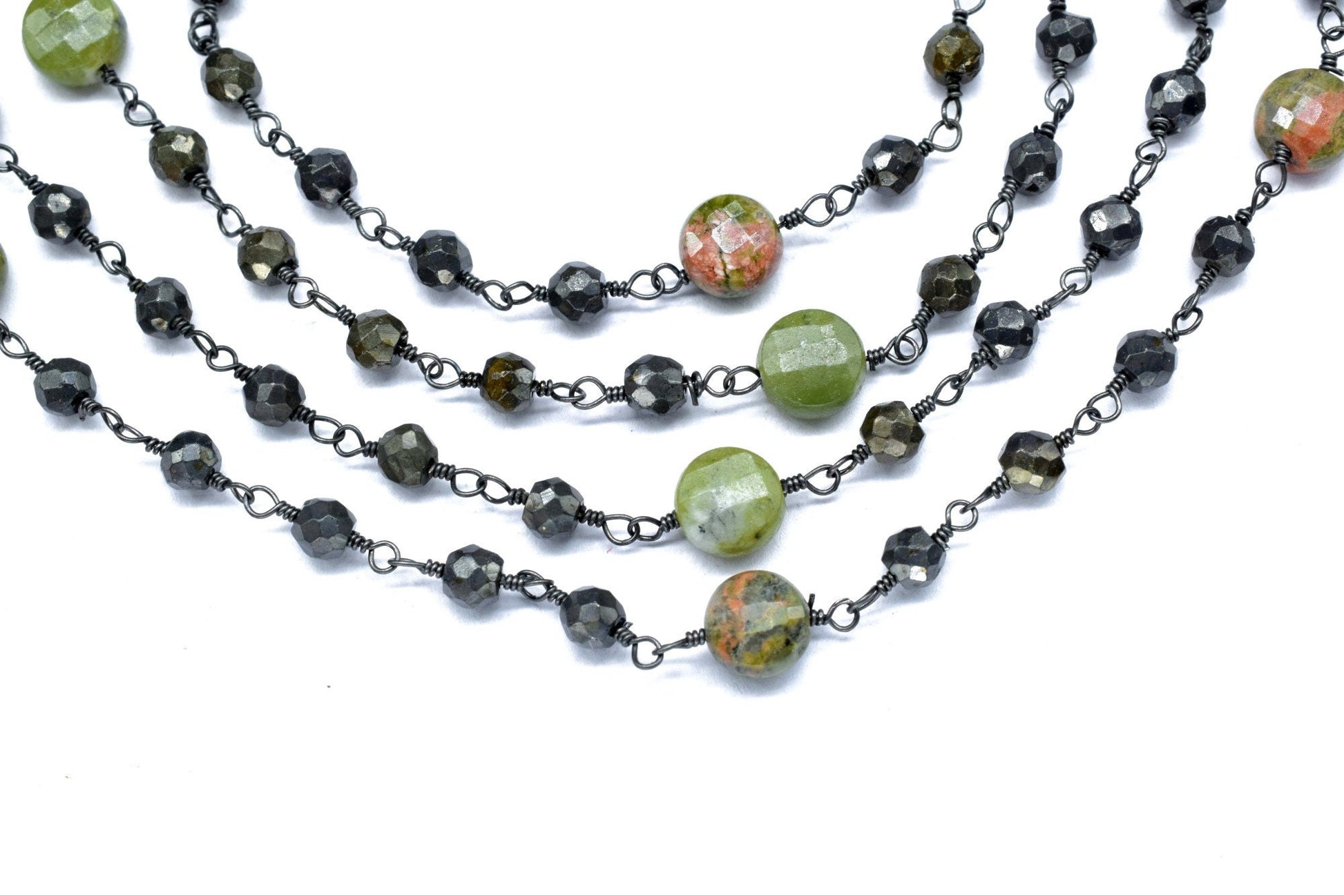 Natural Pyrite Rosary Chain, 3.5mm-4mm Faceted Beads, Black Plated Wire Wrapped Chain,Faceted Pyrite Bead,Gunmetal Plated Rosary,Chains,