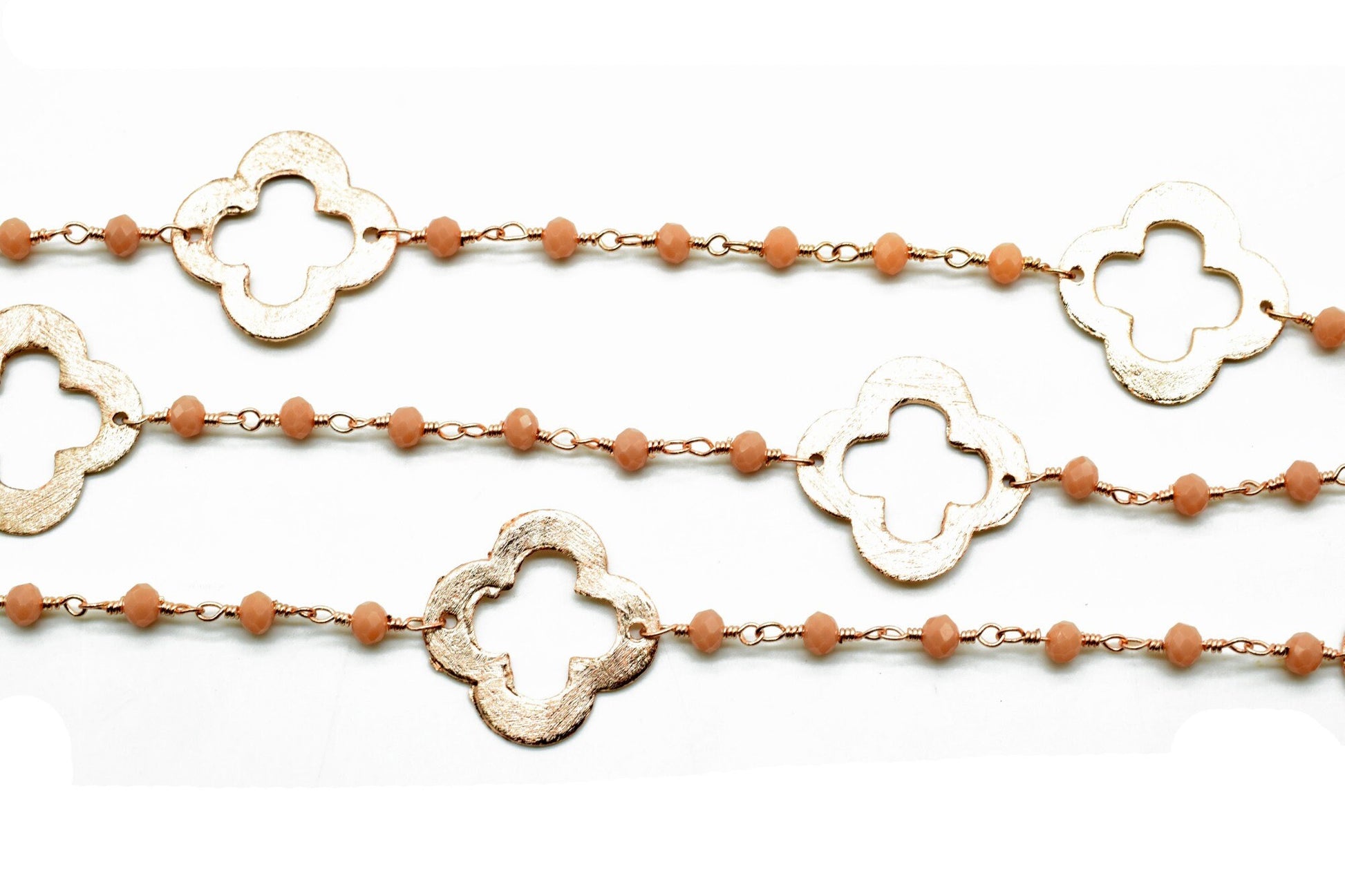 Peach Agate 3mm Beaded Chain,Peach Agate Rosary Chains,Peach Agate Gold Plating Wire Wrap Chain,Brass chain,charm rosary,clover rosary chain