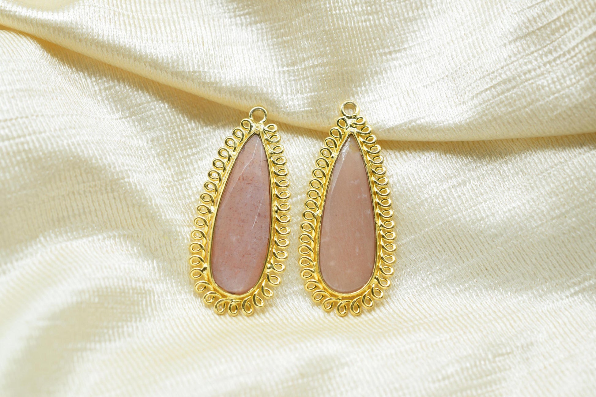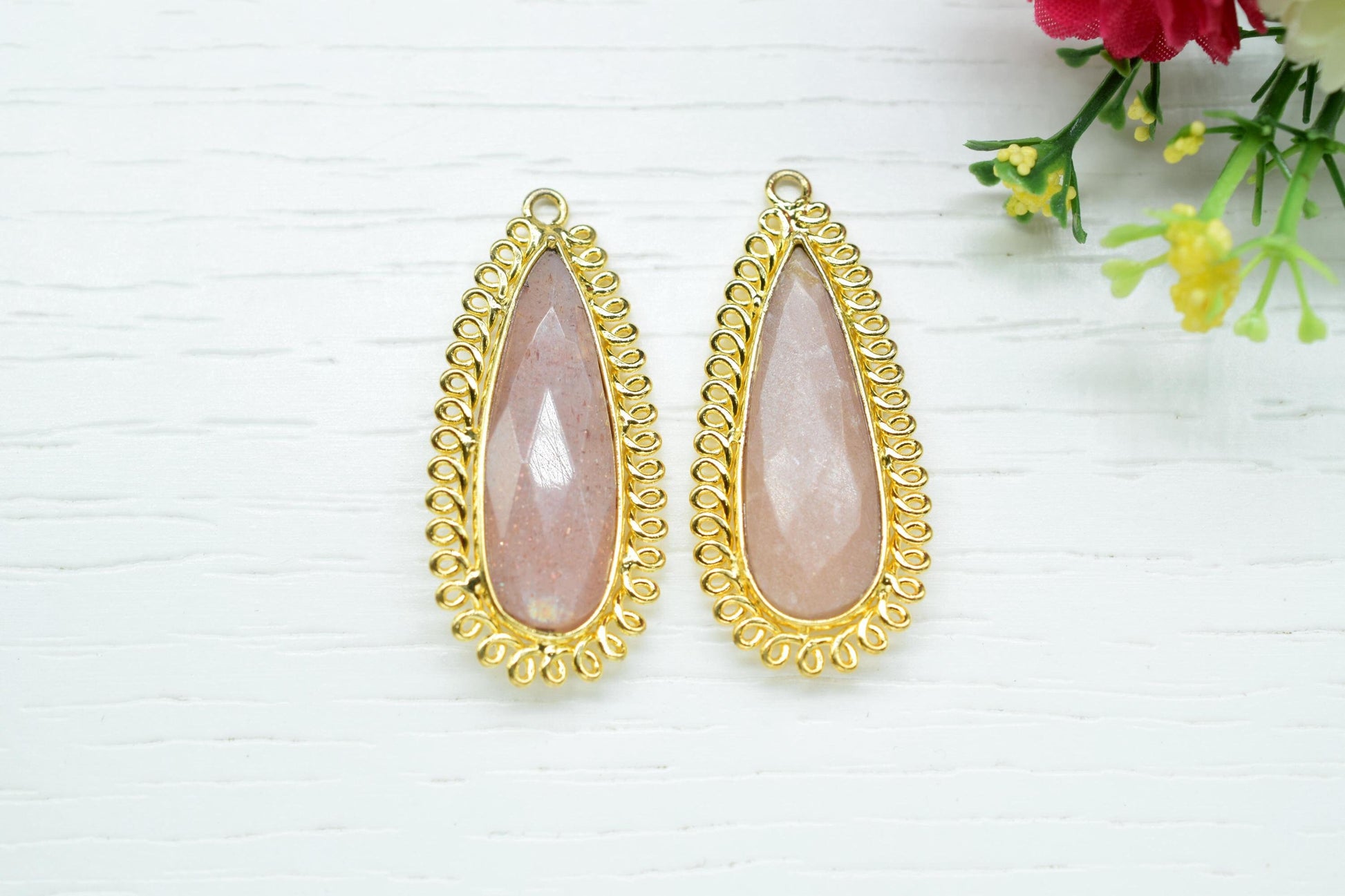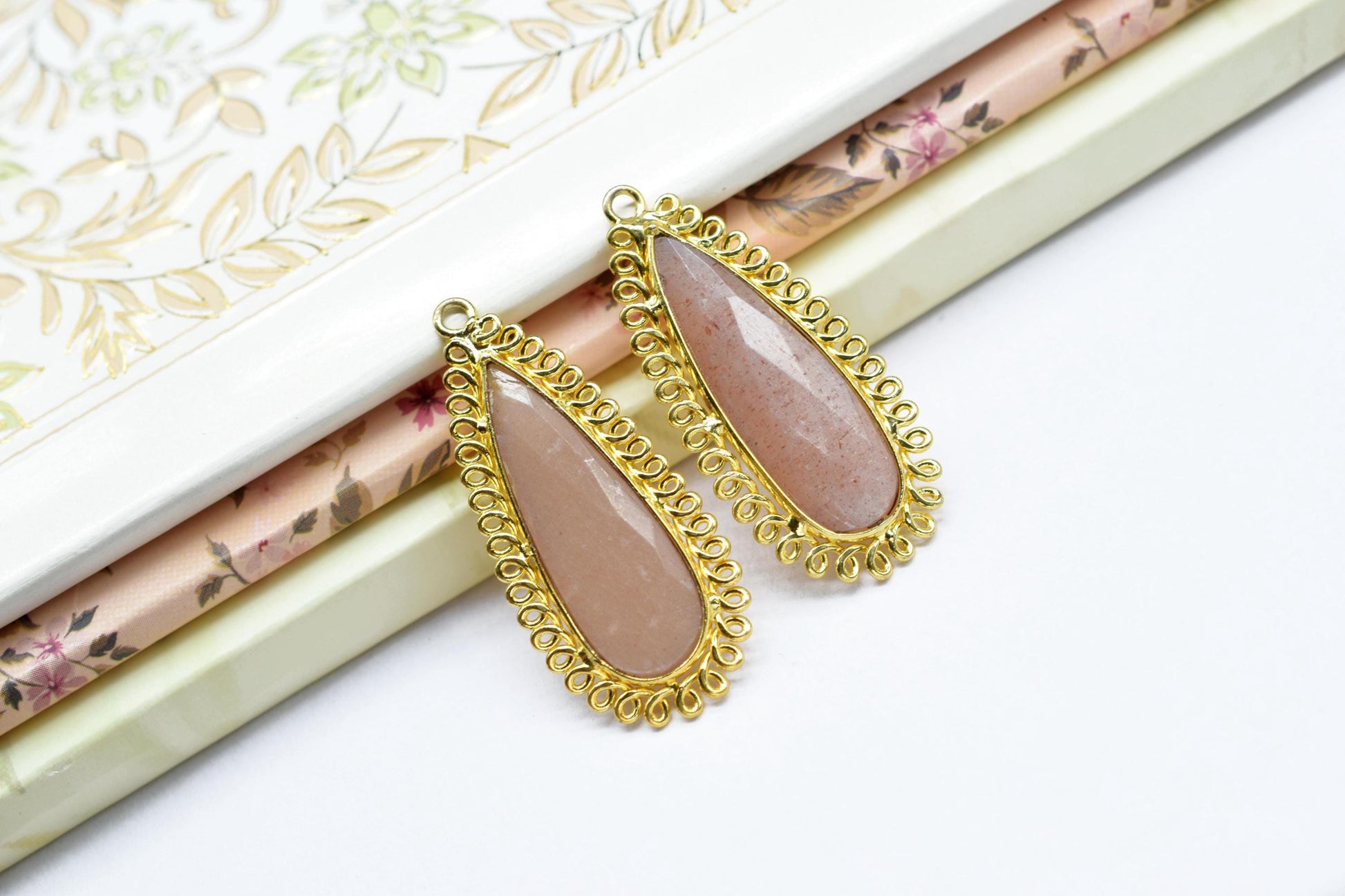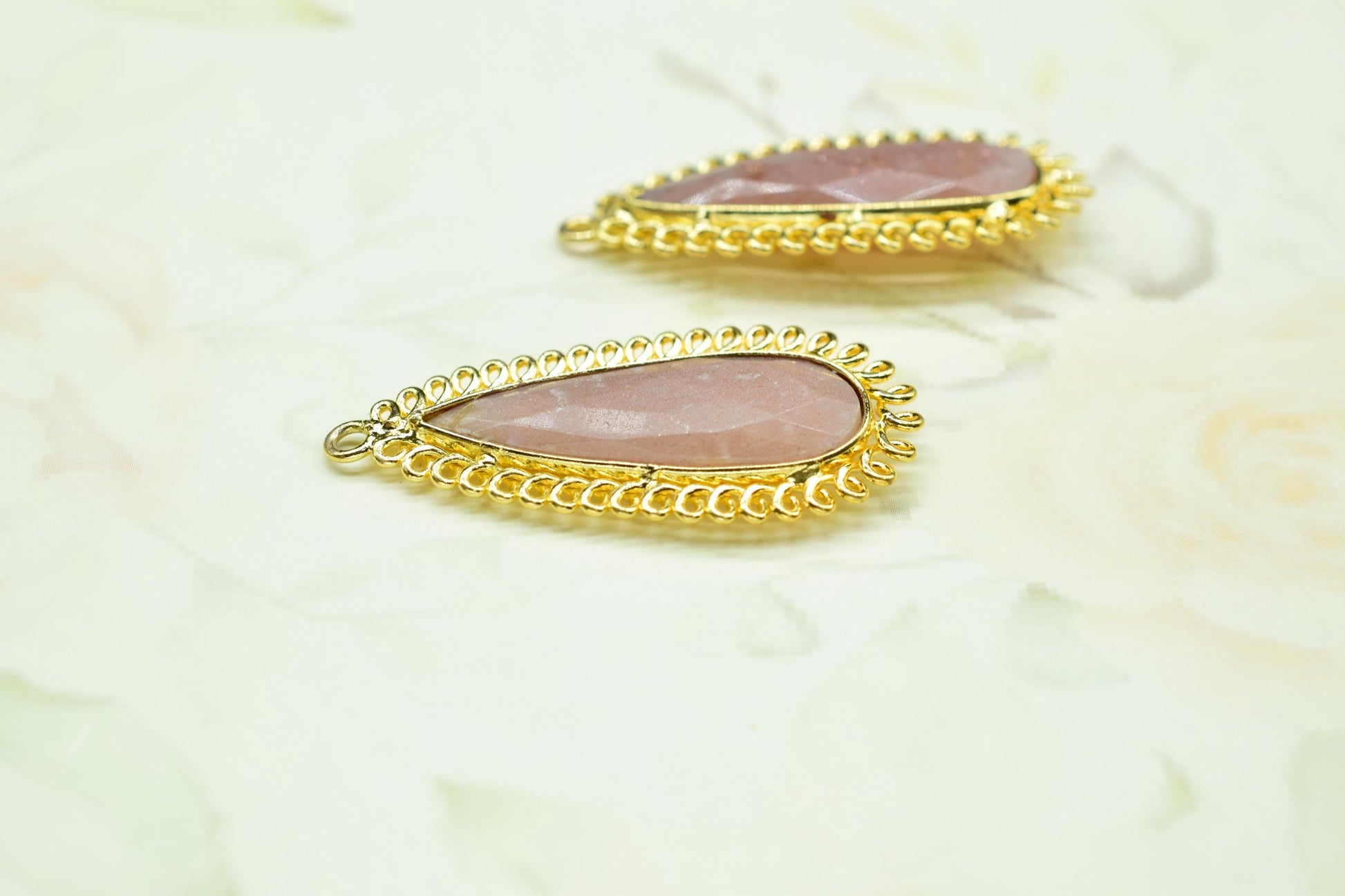 Peach Moonstone 10x30mm Teardrop Bezel Charm,Single Bail Pendant,Handmade Jewellery Connectors,Gemstone Brass Component,Handmade Connector