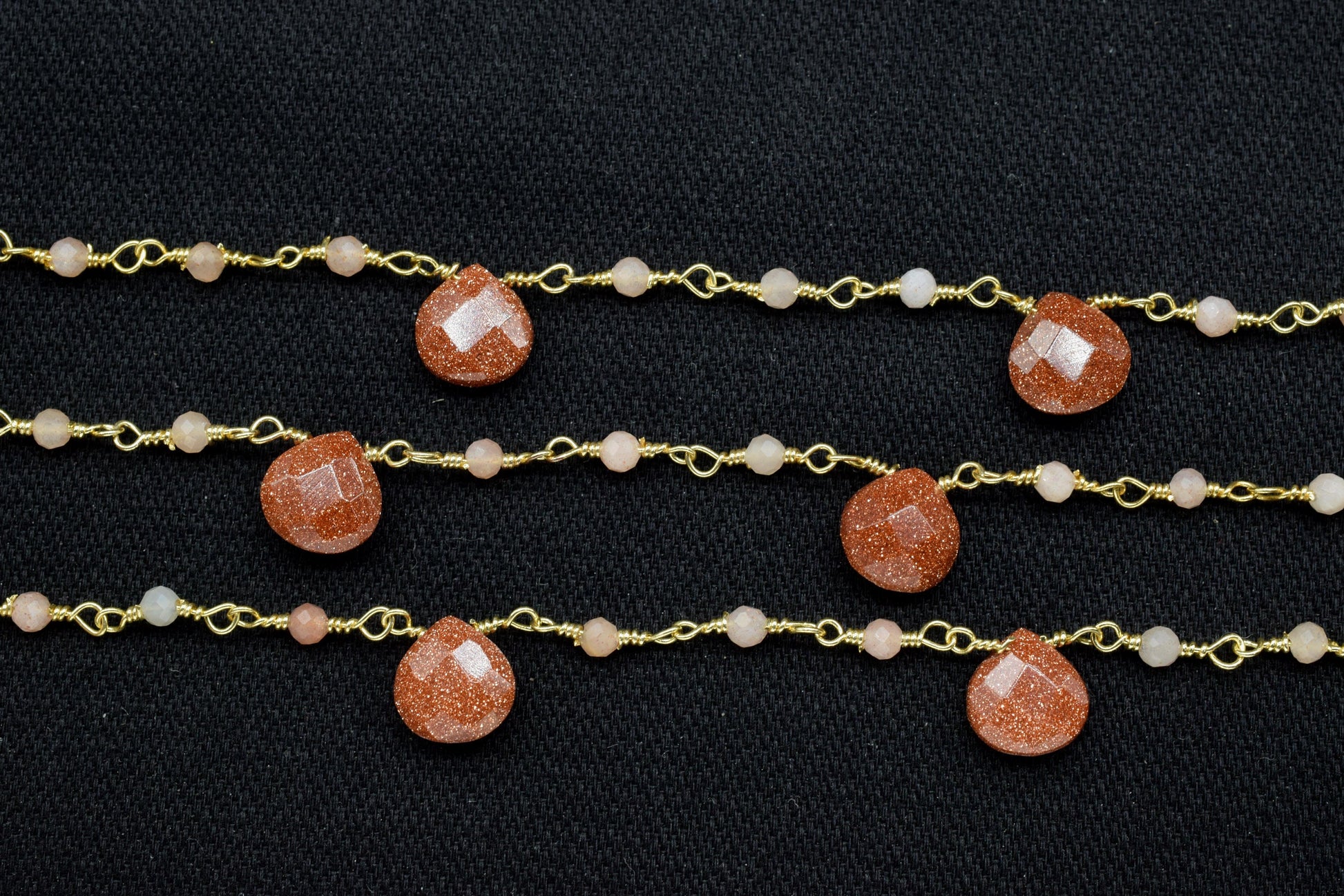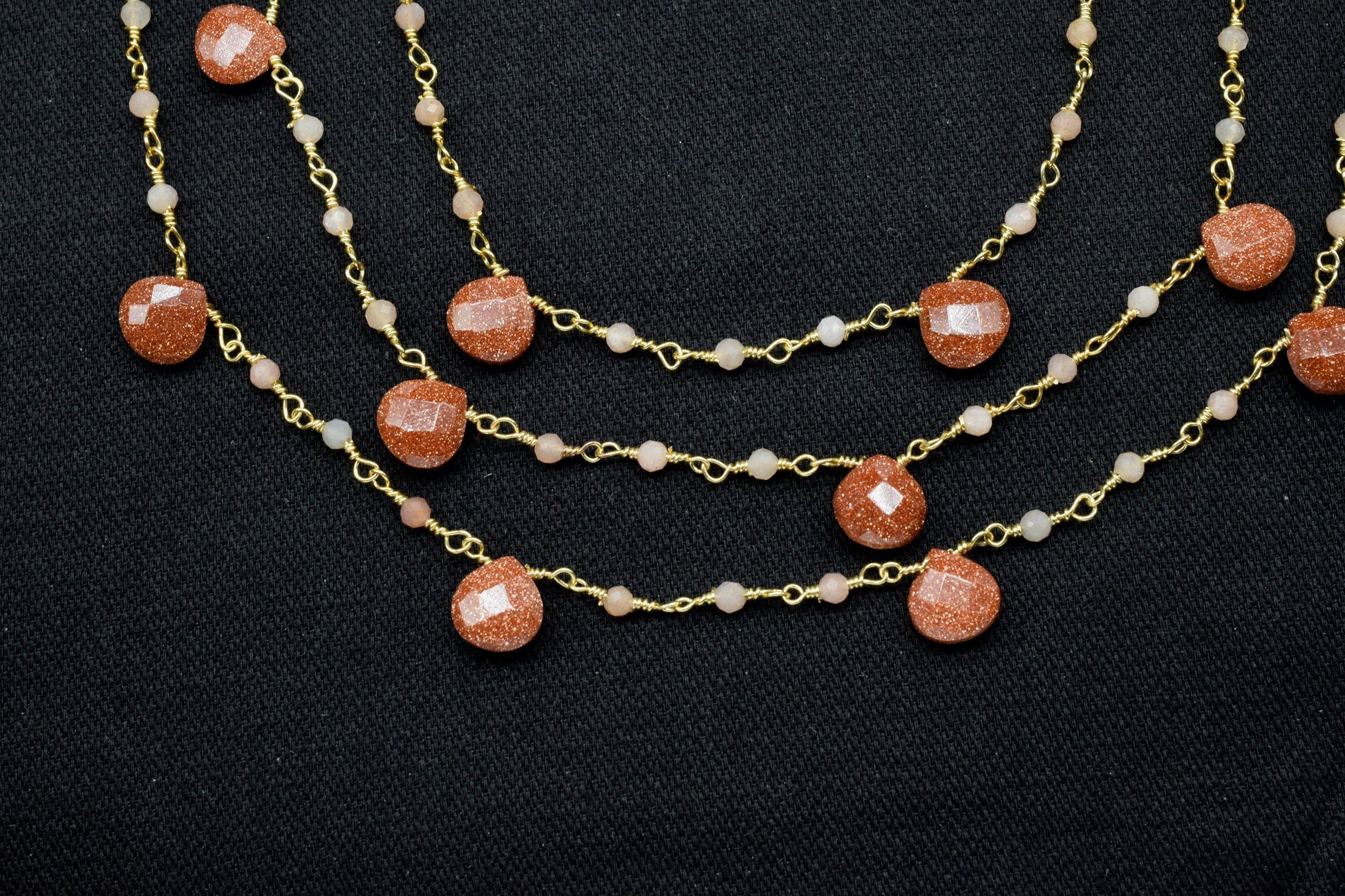 Peach Moonstone Beads Rosary,Silver Plated,Wire Wrapped link Stone Rosary,Heart Shape Briolette Chain, New Style Rosary,sunstone rosary,