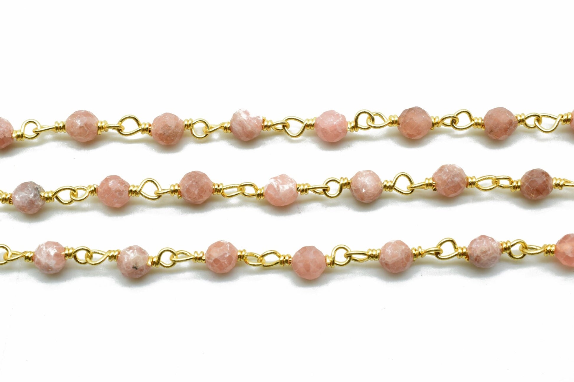 Rhodochrosite 3mm Beaded Chain,Gold Plated Wire Wrapped Rosary Chain,rhodochrosite beaded chain, stone links,antiqued gold finish rosary