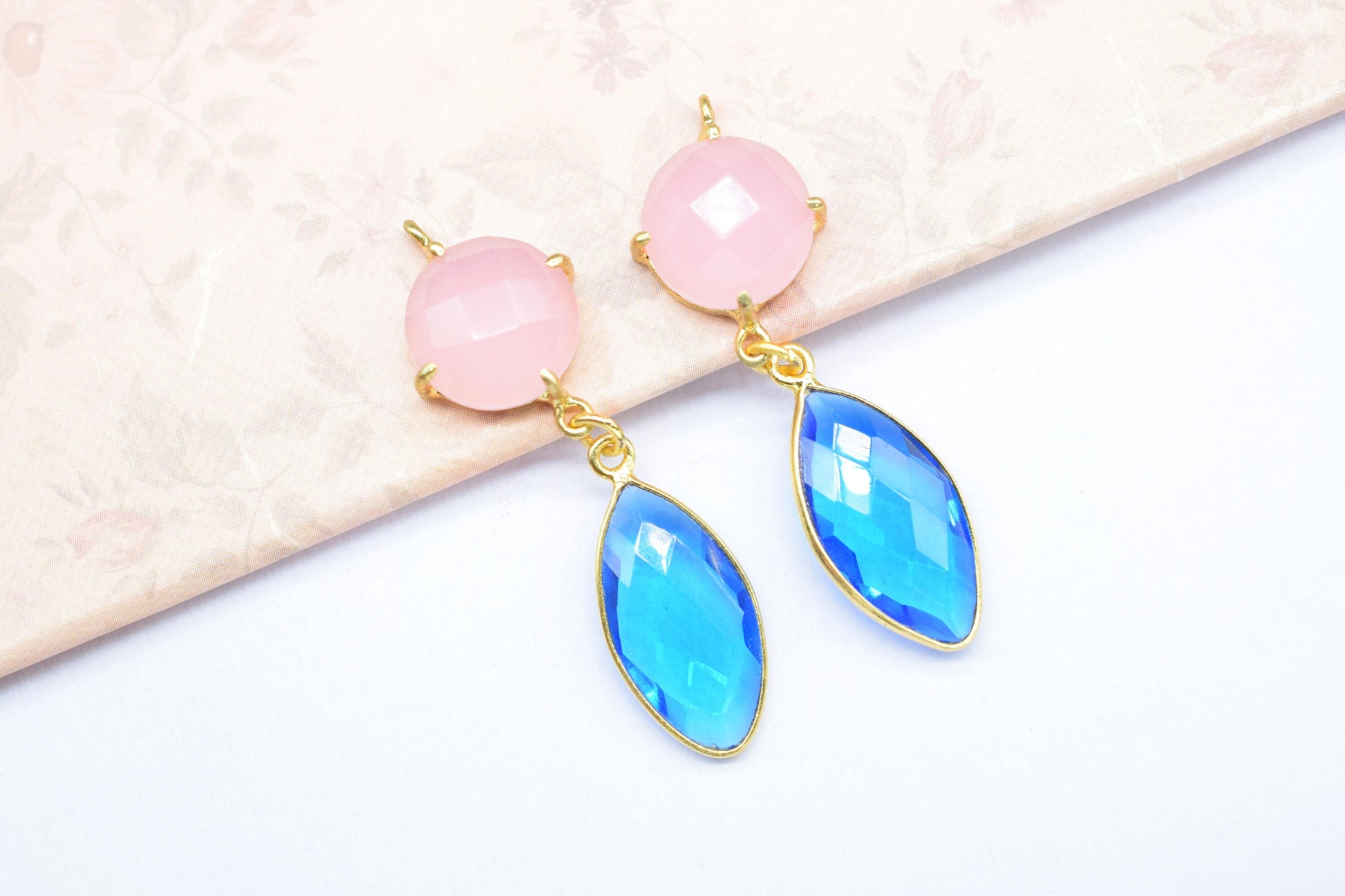 .Rose Quartz Prong Bezel Charms Connector/Handmade Jewelry/Blue Topaz Jewellery/Earring Connector/Station Bezel Link Pendant/Women Jewelry