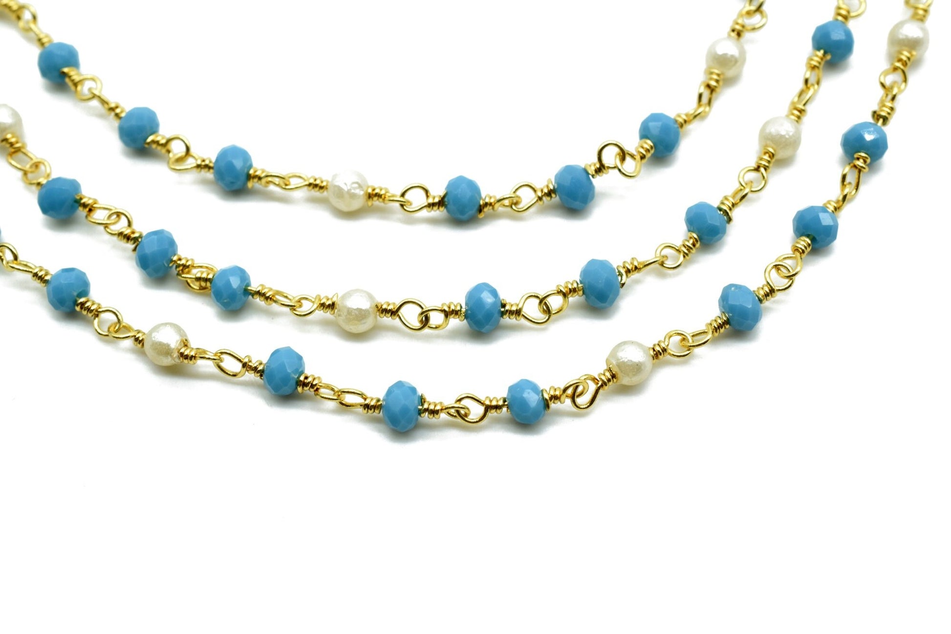 Turquoise Beaded Chain,Turquoise Faceted Beads Wire Wrapped Chain,pearl rosary ,Brass chains,Jewelry Making Chain,Turquoise Beads rosary
